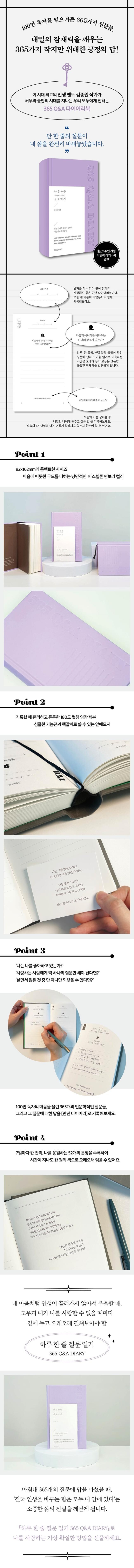 100만 독자가 인정한 베스트셀러 작가이자 2040세대의 인생 멘토 김종원 작가가 많은 독자들의 관심과 사랑을 받아온 질문 콘텐츠만 모아 『하루 한 줄 질문 일기 365 Q&A DIARY』를 선보인다. 2040세대의 취향을 고려한 고급스러운 소재와 심플한 디자인으로 제작하여 한 해 동안 애쓴 나에게, 그리고 사랑하는 가족, 친구, 연인, 지인들에게 선물하기 참 좋은 다이어리북이다.