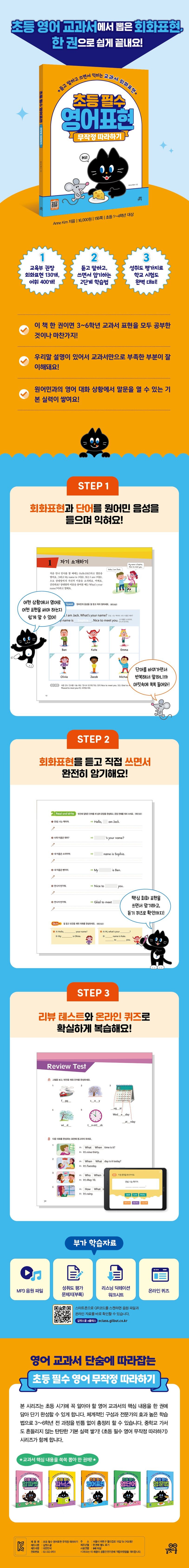Step1에서 듣고 따라 말하고, Step2에서 직접 손으로 써 보며 영어표현을 확실하게 익혀요. 회화 문장에 단어를 바꿔가며 다양한 문장으로 확장 연습해요.