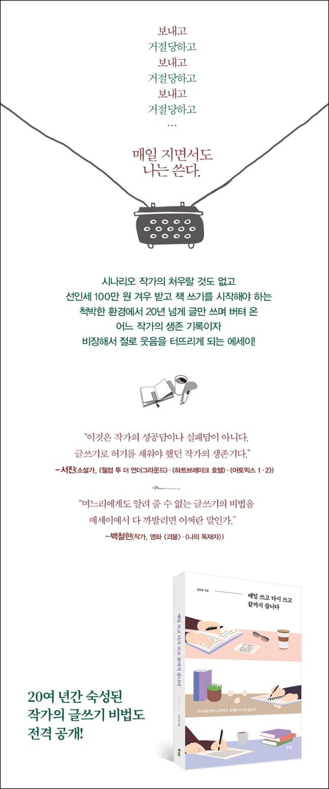 이제는 중견 작가로 자리 잡았다고 봐도 될 이력이다. 하지만 저자는 여전히 다음 소설을 쓸 시간과 생계비를 확보하기 위해 시나리오를 쓰고 다른 글들도 쓴다. 소설을 써 놨다고 해서 출간을 확신할 수 있는 것도 아니고 말이다.