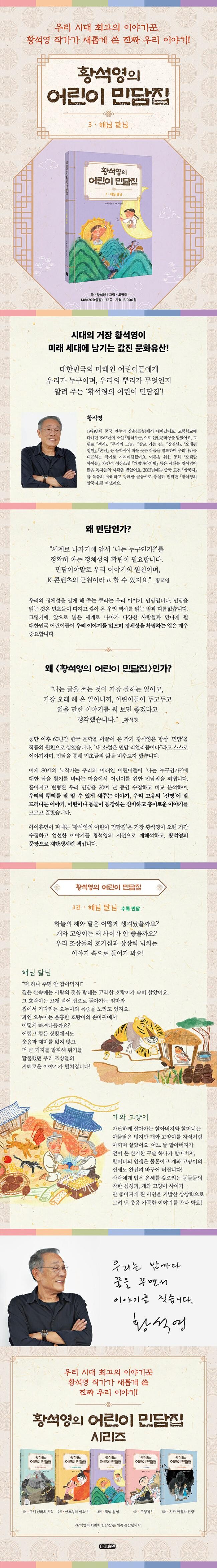 우리 민담에는 슬픔과 괴로움도 익살과 재치를 통해 신명의 정서로 승화하고, 은혜를 입으면 갚고, 베풀면 돌아온다고 믿고 꿋꿋하게 살아 나간 조상들의 삶이 그대로 녹아 있습니다. 어린이들은 『황석영의 어린이 민담집 3. 해님 달님』을 읽으며 우리의 먼 뿌리를 만나고 그 정신을 이해할 수 있을 것입니다.