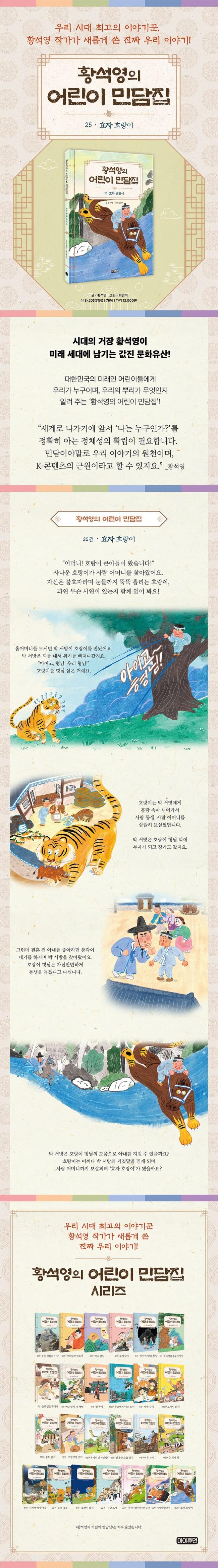 『황석영의 어린이 민담집 25. 효자 호랑이』에서는 사람을 잡아먹으려고 드는 무시무시한 모습과 사람에게 복을 가져다주는 신령스러운 모습, 또 사냥꾼의 꾀에 당하거나 사람을 어머니, 동생으로 여기며 살뜰히 보살피는 친숙한 모습을 모두 가진 호랑이를 만날 수 있답니다. 우리 조상들에게 호랑이가 어떤 존재였는지 『황석영의 어린이 민담집 25. 효자 호랑이』를 통해 알아봐요!