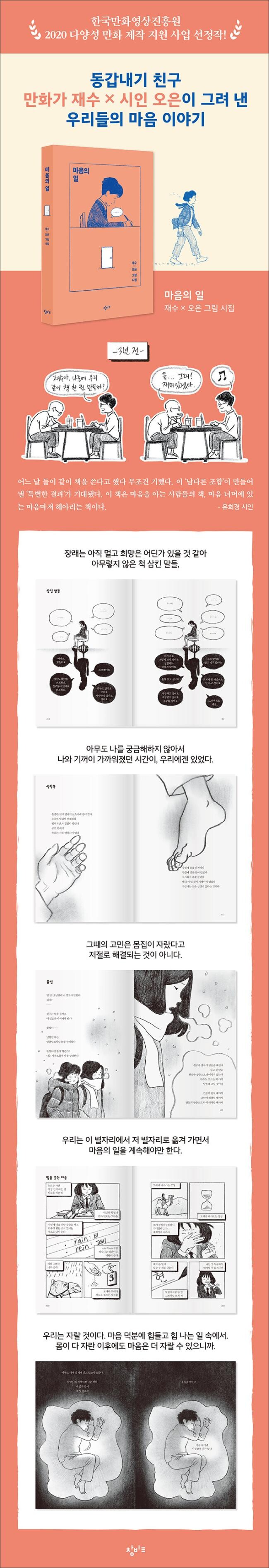 <마음의 일: 재수x오은 그림 시집>은 여전히 진행 중인 그 시절의 고민을 오늘로 데려와 단단하게 다지고, 다정하게 다독이며 위로한다. 우리는 ‘피곤해’, ‘작아져’, ‘나는 오늘 불행해’처럼 어두운 말을 중얼거리는 ‘나’와 “나는 오늘 피어나”겠다고 다시금 희망을 품는 ‘나’가 하루에서 몇 번씩 교차되는 일상을 살고 있다. 오은과 재수는 그것을 잘 알기에 자기를 쓰다듬어 줄 사람이 절실한 아이, 고민은 많은데 해결된 건 하나도 없는 아이, 길고 깊은 밤에 잠 못 드는 아이, 어깨를 축 늘어뜨리며 그림자와 함께 걷는 아이 등 우리 안에 숨어 있는 ‘아이’에게 다가가 손을 내민다.
