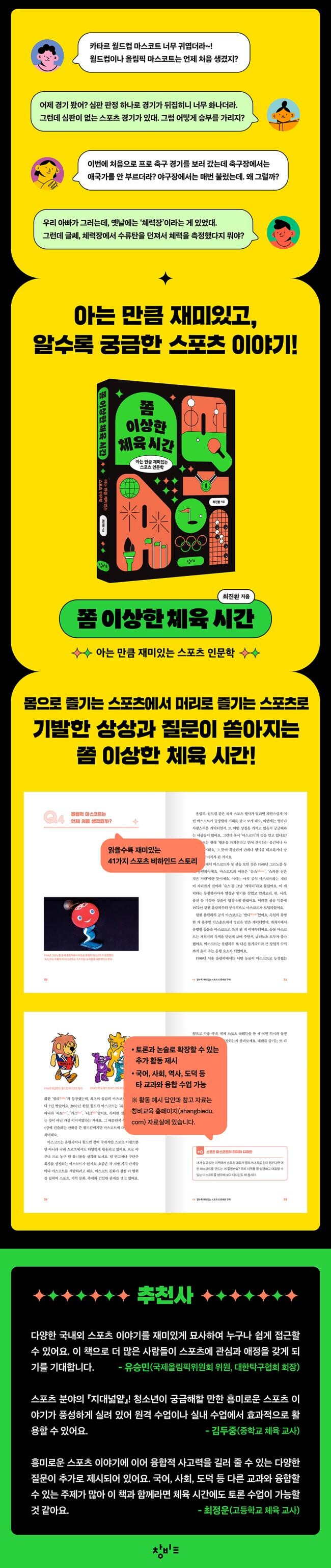 『쫌 이상한 체육 시간』은 스포츠 분야의 진로를 고민하는 청소년에게 권하기 좋은 책이다. 어떤 스포츠 분야의 진로를 선택하든 우리 사회에서 스포츠의 위상과 역할이 어떻게 변화해 왔는지 알아 둘 필요가 있기 때문이다. 이 책은 축구, 야구, 골프 등 인기 스포츠부터 레슬링, 바둑, 비치 핸드볼 같은 다소 생소한 종목까지 두루 다루고 있다. 또한 퍼스널 트레이너, 스포츠 데이터 분석가, 스포츠 카운슬러 등 다양한 스포츠 관련 직업을 소개하고 있다. 더불어 일반 진로 도서에서는 잘 다루지 않는 엘리트 체육과 학교 체육의 문제, 프로로 데뷔하지 못한 학생 선수들, 취업을 해야 하는 체육 전공자들이 겪을 수 있는 현실적인 문제들도 다루고 있다. 학생 선수 출신의 체육 교사인 저자가 직간접적으로 경험한 진로 이야기를 진솔하게 담아 내어 스포츠 분야 진로를 희망하는 청소년들이 스포츠를 즐기면서도 미래를 단단하게 설계해 나갈 수 있도록 돕는다.