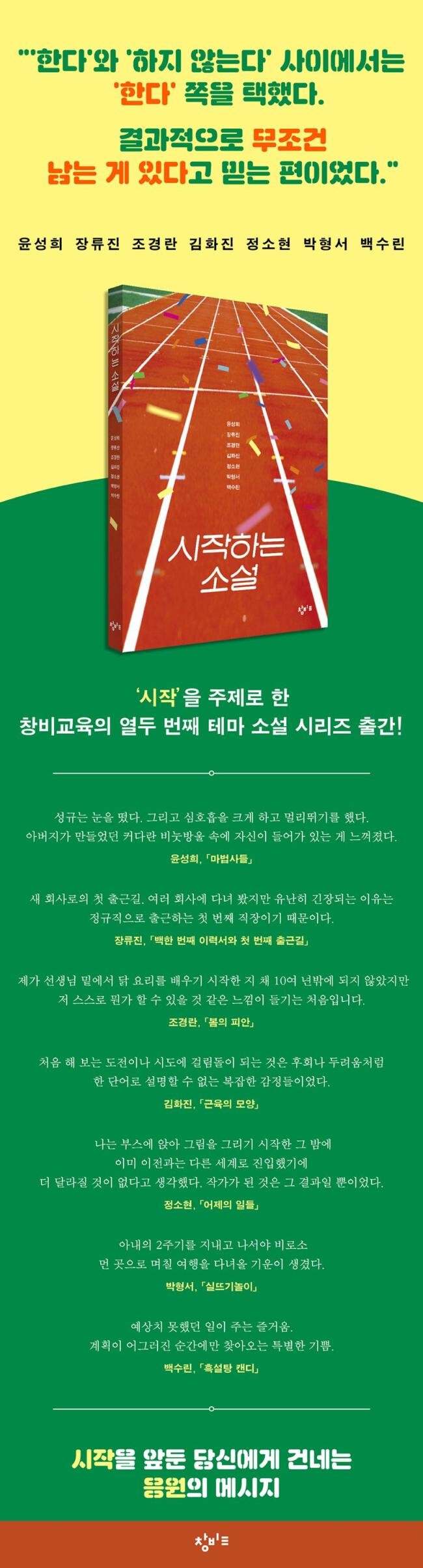 우리는 살아가며 수많은 ‘시작’의 기회를 만나지만 그럴 때마다 늘 자신 있게 뛰어들기란 쉽지 않다. 무언가를 완수해야 한다는 부담감, 알 수 없는 결과와 목적지에 대한 불안감, 낯선 상황에 대한 두려움이 들기 때문이다. 이 소설집은 그러한 우려를 가뿐히 뛰어넘으며 용기 있는 발걸음을 내디딘 인물들의 반짝이는 이야기를 담아냈다. 사실 시작의 허들이 그리 높지만은 않다고, 당신은 지금도 매 순간 새롭게 시작하고 있다며 응원의 메시지를 전한다.