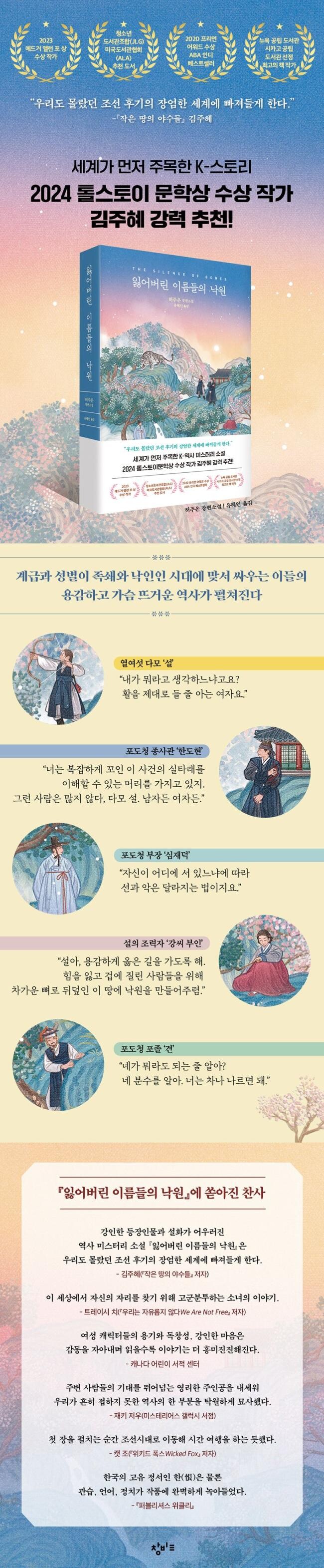 에드거 상(Edgar Allan Poe Award) 수상(2023)의 쾌거를 이룬 한국계 작가 허주은의 장편소설 『잃어버린 이름들의 낙원』(The Silence of Bones)이 창비교육에서 출간되었다. 에드거 상은 미스터리, 스릴러, 범죄 소설 분야에서 최고의 영예 중 하나로 여겨지며 역대 수상자로는 전설적인 추리 작가 스티븐 킹, 레이먼드 챈들러, 길리언 플린 등이 있다. 허주은은 캐나다 최대 규모 독서 프로그램 ‘화이트 파인 어워드’ 최종 후보, 뉴욕 공립 도서관과 시카고 공립 도서관이 뽑은 ‘최고의 책’ 작가에 이름을 올렸을 뿐 아니라 미국서적상협회 ABA 인디 부문 베스트셀러에 여러 번 작품이 선정되는 등 해외 평단과 대중을 모두 사로잡았다. 또한 국내에 소개된 역사 미스터리 소설 『사라진 소녀들의 숲』 『붉은 궁』 등이 베스트셀러에 오르며 국내외에서 탄탄한 팬층을 확보하였다.