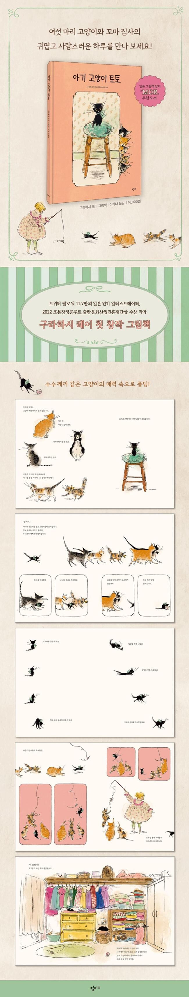 다묘 가정의 집사인 구라하시 레이가 자신의 반려 고양이들을 모델로 작업한 『아기 고양이 토토』는 도통 이해할 수 없는 고양이들의 엉뚱한 행동을 사실적으로 묘사해 웃음을 자아내는 작품이다. 수수께끼 같은 고양이의 특성은 ‘토토’라는 등장인물을 통해 유머러스하게 드러난다. 여섯 마리 고양이 중 가장 작고 까만 토토는 밥 먹는 시간이나 놀이 시간에는 누구보다 빠르게 달려오지만, 집사가 이름을 부를 땐 좀처럼 오지 않는다. 낮잠 시간이 되면 창가 아래에서 본능적으로 따뜻한 햇살 아래를 찾고, 나란히 누워 낮잠을 자다가도 집사가 눈을 떠 보면 어디론가 사라져 집안 구석구석을 찾아다니게 만든다. 힘들게 찾아 내면 어둡고 좁은 곳에서 자고 있기 일쑤고, 같은 자리에서 내내 잠을 청하다 밤이 되어 집사가 자러 갈 준비를 시작하면 그제야 기지개를 켜고 활동 재개를 준비한다.