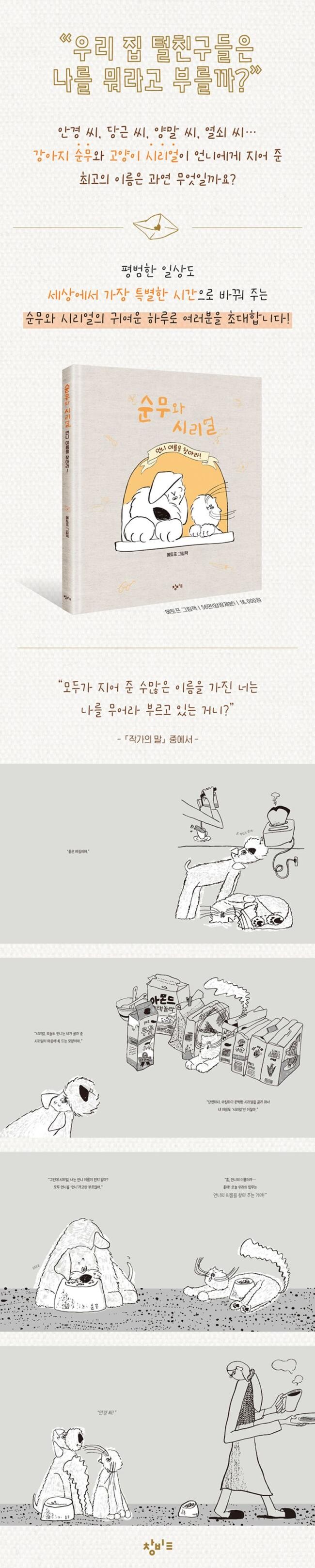 ‘사람들이 지어 준 이름에 반응하는 반려동물들은 우리를 뭐라고 부를까?’라는 신선한 질문에서 출발한 이 작품은 자아와 관계, 소속과 소유에 대한 개념이 형성되기 시작하는 유아기 아이들도 즐기기 좋은 그림책이다. 유아기의 많은 아이들은 오로지 자신에 대한 탐색이 전부였던 시기를 지나 점차 가족과 친구 등 타인으로 관심의 범위를 넓혀 가며, 엄마나 아빠, 할머니나 이모 등 가족 호칭 외에도 ‘이름’이 있다는 사실에 놀라기도 한다. 이때 반려동물이 주인의 이름을 만들어 주는 이야기인 「순무와 시리얼, 언니 이름을 찾아라!」를 접한다면 애정을 담아 타인을 불러주는 행위와 이름의 의미에 대해 생각해 볼 수 있는 계기가 될 것이다. 더불어 나에게 이름을 지어 준 존재의 이름을 새롭게 찾아가는 과정에서 포도알같이 둥근 안경, 햇살처럼 따뜻한 수프 등 비유법을 자연스럽게 익힐 수도 있다. 또한 작품 속 주인공인 순무와 시리얼은 어린이들이 가장 친근하게 여기는 강아지와 고양이로, 작은 몸집 덕분에 더욱 쉽게 교감하고 이입할 수 있는 존재다. 이 작은 동물들이 만들어 가는 따뜻한 순간들은 등장인물의 시선을 통해 어린이 독자들도 함께 보고 느낄 수 있는 행복의 순간을 선사할 것이다. 한편 이 책은 에토프의 동양화 기법을 활용한 드로잉 작업이 고스란히 느껴질 수 있도록 회색빛 종이(Greenish Gray)에 먹과 백, 두 가지 색만을 사용해 인쇄하는 독특한 제작 방식을 택해 소장 가치를 더한다.