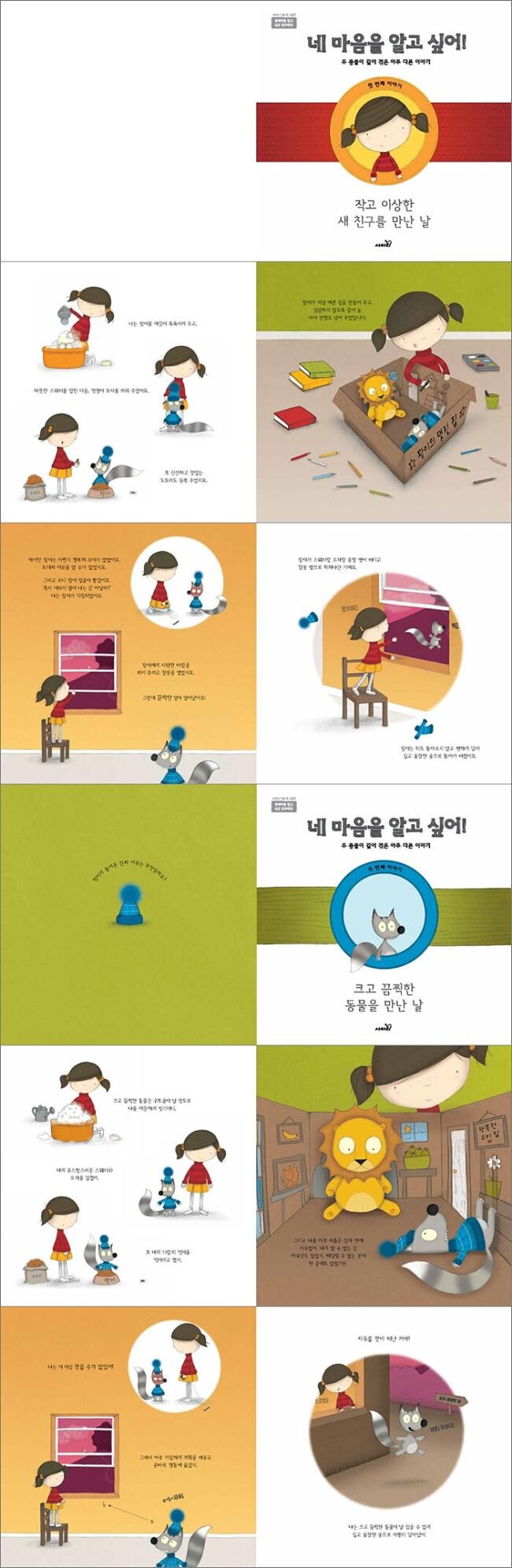 《네 마음을 알고 싶어!》는 같은 상황을 아주 조금씩 달리 묘사해 놓은 장면을 서로 비교해 봄으로써 두 주인공의 심리 상태를 알아차릴 수 있어 더욱 흥미로워요. 세심하게 살펴보면 여자아이와 작고 이상한 동물 중 누가 이야기를 끌어가는가에 따라 등장인물들의 표현과 대상의 크기가 다르다는 것을 알 수 있지요. 작고 이상한 동물의 이야기에서는 상대적으로 여자아이의 몸집을 크게 그림으로써 동물의 입장에서는 여자아이가 위협적으로 느껴지도록 표현했거든요. 같은 상황이지만 각각의 주인공들의 심리에 따라 조금씩 달라지는 주인공들의 표정만으로도 충분히 이야기를 공감할 수 있고, 마음의 변화와 반응의 차이를 비교해 보는 것 또한 쏠쏠한 재미를 줍니다.