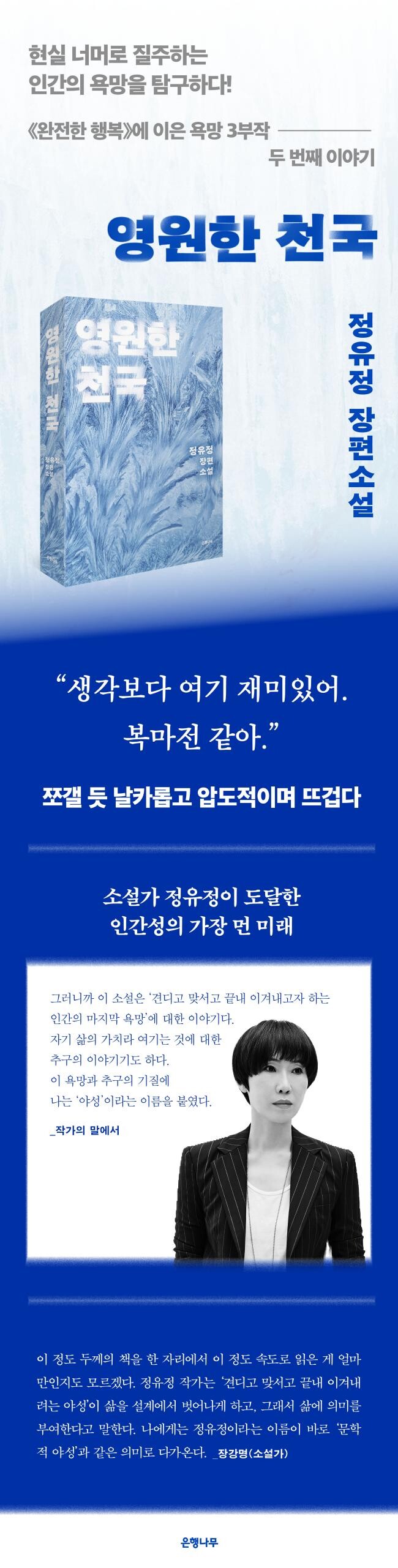 어떤 설계도 없는 삶을 살아보고자 하는 욕망. 그 날것의 세계에 뛰어들어 맞서보려는 욕망. 끝내 제 운명과 씨름하여 이겨내고자 하는 욕망. 인간 욕망의 끝에서 작가가 마주한 것은 바로 이 펄펄 끓어오르는 야성이다. 두꺼운 유빙 아래의 추운 심해에서, 뜨거운 사막의 태양 아래서 정유정이 길어 올린 것은 골수를 쪼갤 듯 날카롭고 압도적이며 뜨겁다. ‘욕망 3부작’의 두 번째 작품이 이토록 선연한 이유다.