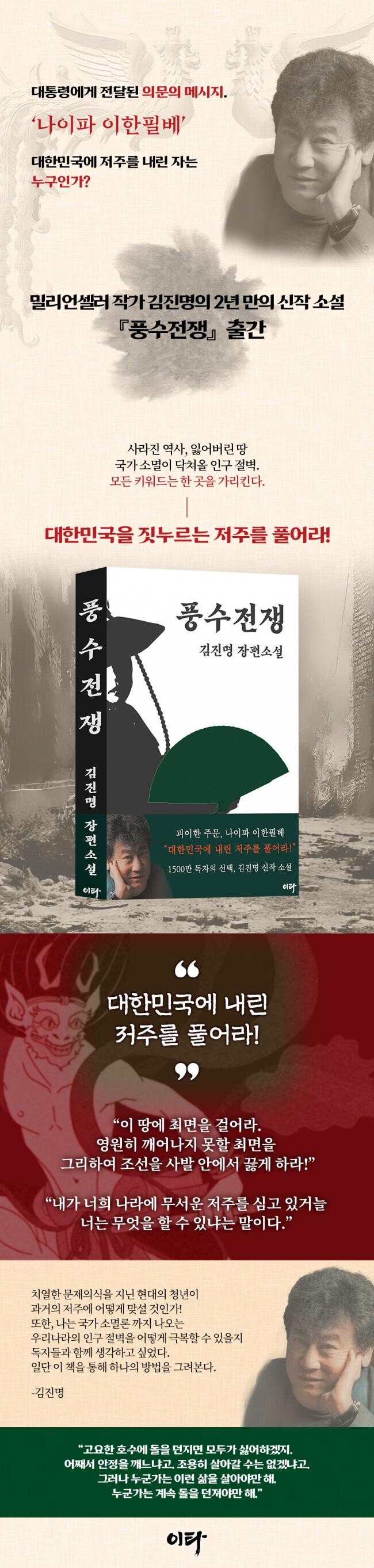 『풍수전쟁』은 김진명 작가가 선보이는 2년 만의 신작 소설로, 사회를 향해 망설임 없이 예리한 질문을 던지는 작품을 기다린 독자들에게 뜻깊은 소식으로 다가설 것이다.