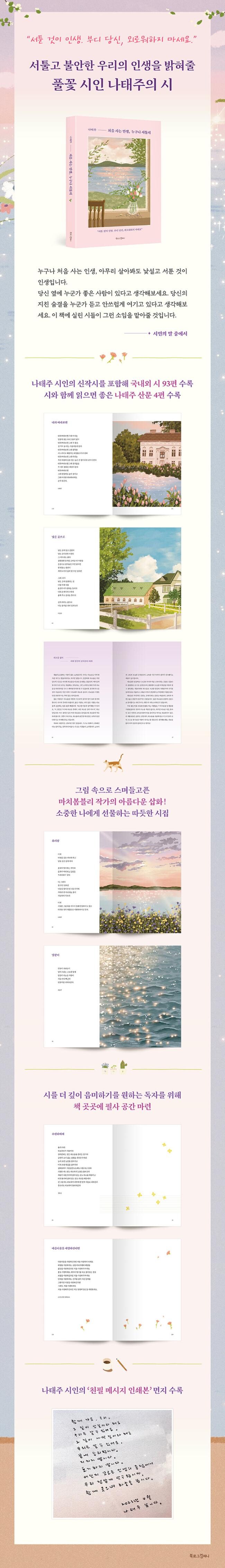 『처음 사는 인생, 누구나 서툴지』에는 서툰 오늘 하루에 위로가 필요한 사람들을 위한 시가 담겼다. 나태주 시인의 시 16편과 그가 엄선해 뽑은 국내외 시인의 시 77편까지 총 93편이다. 전 국민의 애송시이지만 읽을 때마다 울림을 주는 나태주 시인의 <내가 너를>, 정호승 시인의 <수선화에게>부터 잘 알려지지 않아 더욱 보석 같고 소중한 시들까지 다채롭게 채워져 있다.