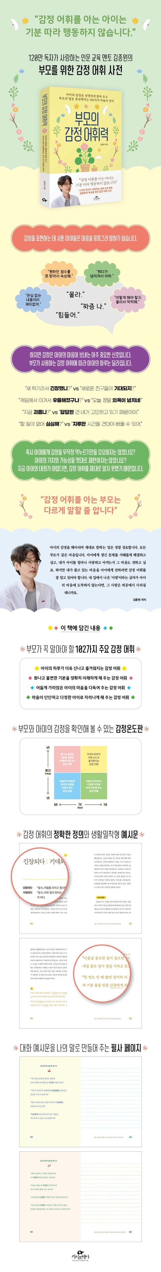 뛰다가 넘어져서 아플 때도, 원하던 점수를 받지 못해 속상할 때도, 관심 없는 내용이라 재미없다고 느껴질 때도, 잘해 보고 싶은데 어떻게 할지 몰라 막막할 때도, 아이들은 “몰라”, “짜증 나”, “힘들어” 같은 짧은 말들로 자신의 감정을 뭉뚱그려 말한다. 왜 그럴까? 아이들은 복잡한 자기 마음을 표현하는 데 아직 서툴기 때문이다. 그런데 이는 부모 역시 마찬가지다. 지금 아이의 마음 상태와 기분을 무슨 말로 나타낼지 알려 주기 위해서는 먼저 부모 자신의 감정을 들여다볼 줄 알아야 하지만, 우리는 감정을 표현하는 일에 익숙지 않은 환경에서 자라왔다. 하지만 감정은 아이의 마음이 보내는 아주 중요한 신호다. 자녀교육 분야 40주 연속 베스트셀러로, 출간 이후 독자들의 뜨거운 사랑을 받았던 《부모의 어휘력》이 이번에 특별히 ‘감정 어휘’에 주목한 이유다.