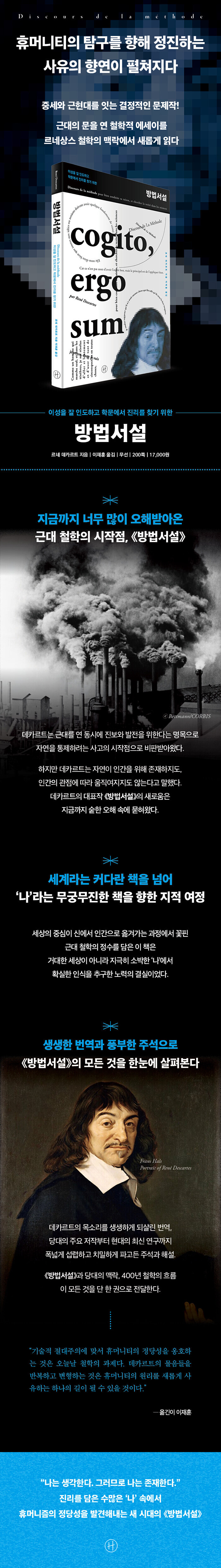 휴머니티의 탐구를 향해 정진하는사유의 향연이 펼쳐지다중세와 근현대를 잇는 결정적인 문제작!근대의 문을 연 철학적 에세이를르네상스 철학의 맥락에서 새롭게 읽다인류의 세계관이 재정립되는 혼란의 시대, 데카르트의 《방법서설》은 근대 철학의 시작을 알린 총성과도 같은 책으로 자리매김해왔다. 새 시대를 연 이 저작은 중세와 근대의 급작스런 단절을 상징해왔지만, 데카르트 또한 수많은 사상가들과 마찬가지로 당대의 영향 아래 사유했음이 분명하다. 그를 이전 시대와 단절시켜 읽는 것은 핵심을 놓치는 일이다. 옮긴이 이재훈은 국내에서 본격적으로 다뤄지지 않은 르네상스 철학과의 연관 안에서 《방법서설》을 읽음으로써 오늘날 다시금 그의 철학이 필요한 이유를 휴머니즘의 정당성이라는 관점으로 새롭게 설명해낸다.권위를 담보한 중세 신학자들은 불완전한 인간이 스스로 진리에 이를 수 없다고 말해왔다. 하지만 데카르트가 탐구한 진리의 뿌리와 결실은 모두 인간의 지성과 문화, 이성에서 비롯한다는 점에서 새로웠다. 한편 신에서 인간으로 초점을 옮겼다고 평가받는 데카르트는 인간중심주의의 폐해를 내포하는 시작점으로도 비판받아왔다. 하지만 옮긴이는 인간중심주의에 대한 반발이 확대되는 오늘날, 데카르트가 《방법서설》에서 제안하는 수많은 ‘나’ 속 무한의 휴머니티를 더욱 생생하게 읽어야 할 필요가 있다고 역설한다. 이것이야말로 역사로서의 철학을 제대로 이해하는 길이다. 독자들은 새롭게 출간하는 《방법서설》을 통해 인간의 고유성에 주목했던 데카르트의 사유를 명징하게 들여다볼 수 있다.1. 르네상스 철학의 계보에서 바라본 데카르트─ 이전까지 다뤄지지 않았던 휴머니스트 전통의 재발견─ 근대 철학을 꽃피운 역사적 토양을 낱낱이 분석하다《방법서설》의 진정한 새로움은 르네상스 시대의 유산에서 시작한다는 데 있다. 1571년 최초로 자기 자신을 글의 소재로 쓰기 시작한 몽테뉴의 《에세》, 1601년 최초로 라틴어가 아닌 프랑스어로 출간된 샤롱의 《지혜에 대하여》, 1620년 새로운 과학을 탐구한 베이컨의 《신기관》까지, 르네상스를 대표하는 이 정신들은 각자의 방식으로 명맥을 이었고 마침내 이 책에서 형이상학의 형태로 종합되어 새 시대의 서막을 올렸다.우주, 신의 무한성, 기술, 회의주의, 세계의 가독성, 자연의 빛, 지혜, 제일철학……. 데카르트 철학의 주요 키워드이자 근대 철학의 주제이기도 한 이 단어들은 르네상스 철학자들의 사유에서부터 형성되기 시작했다. 진리를 찾기 위해 모든 선입견에서 자유로운 철학을 기획한 데카르트는 ‘방법적 회의’를 통해 자신의 사유를 전개했다. 이때 학교와 책에서 배워온 모든 것을 버리고, 의심하고, 그것에 질문을 던진 그의 시도는 허공에서부터 시작된 것이 아니었다. 편견과 관습으로 가득 찬 정신보다 오히려 무지한 자가 진리를 더 성공적으로 탐색할 수 있다는 발상은 쿠자누스와 몽테뉴 등 이전의 사상가들로부터 시작되었다.휴머니스트판 《방법서설》은 데카르트 철학을 제대로 이해하기 위해 르네상스에서부터 근대 철학의 역사적 맥락을 짚어본다. 근대의 여명에서 데카르트는 자신에 앞서 새로운 시대의 가치를 선도해온 선행자들을 충실히 따랐다. 독자들은 데카르트가 철학에 던진 폭발적인 사유를 통해 오늘날 우리가 발 딛고 있는 학문적 토양에 담긴 가치를 보다 면밀하게 살펴볼 수 있다.“그러나 나는, 감히 말하건대, 많은 행운을 가졌다고 생각한다. 나는 젊은 시절부터 어떤 길에 들어서게 되었는데, 이 길들은 나를 어떤 고찰과 준칙으로 이끌었고, 이로부터 나는 방법을 형성했다. 그리고 이 방법을 통해 나는 지식을 단계적으로 증가시키고 인식을 내 정신의 평범함과 삶의 짧은 기간이 도달하도록 허락한 최고의 높은 정도까지 점차로 높일 수 있는 수단을 가지게 된 것처럼 보였다. 실제로 나는 그 방법을 통해 아주 많은 결실을 이미 얻었다. 그 결과 나는 스스로에 대한 판단을 내릴 때 자만하기보다는 불신하려 항상 노력하고, 철학자의 눈으로 바라볼 때 모든 사람의 다양한 행동과 계획 중에 헛되고 무익하지 않게 보이는 것은 거의 없음에도 불구하고 내가 진리 탐구에서 이미 성취했다고 생각한 발전에 크게 만족하지 않을 수 없고 또 순수하게 인간적인 일들 가운데 확고하게 좋고 중요한 어떤 것이 있다면 그것은 바로 내가 선택한 것이라 감히 생각할 정도로 미래에 대한 큰 희망을 갖지 않을 수 없다.” ─ 〈1부〉 중에서2. 데카르트에 관한 오해를 종식시키다─ 진리를 담은 수많은 ‘나’ 속 무한의 휴머니티 탐구─ 인간은 자연이 아닌 오로지 의지에 대해서만 지배자일 수 있다기독교적 관점에서 자연은 그 자체로 해석되어야 하는 존재가 아니었다. 하지만 갈릴레이와 몽테뉴, 데카르트를 거치면서 인간은 자연을 신적 언어가 아니라 논리적 언어로 쓰인 것으로 간주하고 그에 대한 지식을 쌓기 시작했다. 데카르트는 가장 먼저 탐색한 책들의 세계에서 수도 없이 많은 모순과 대립을 발견하고는 진리를 찾기 위해 “세계라는 커다란 책”(27쪽)을 