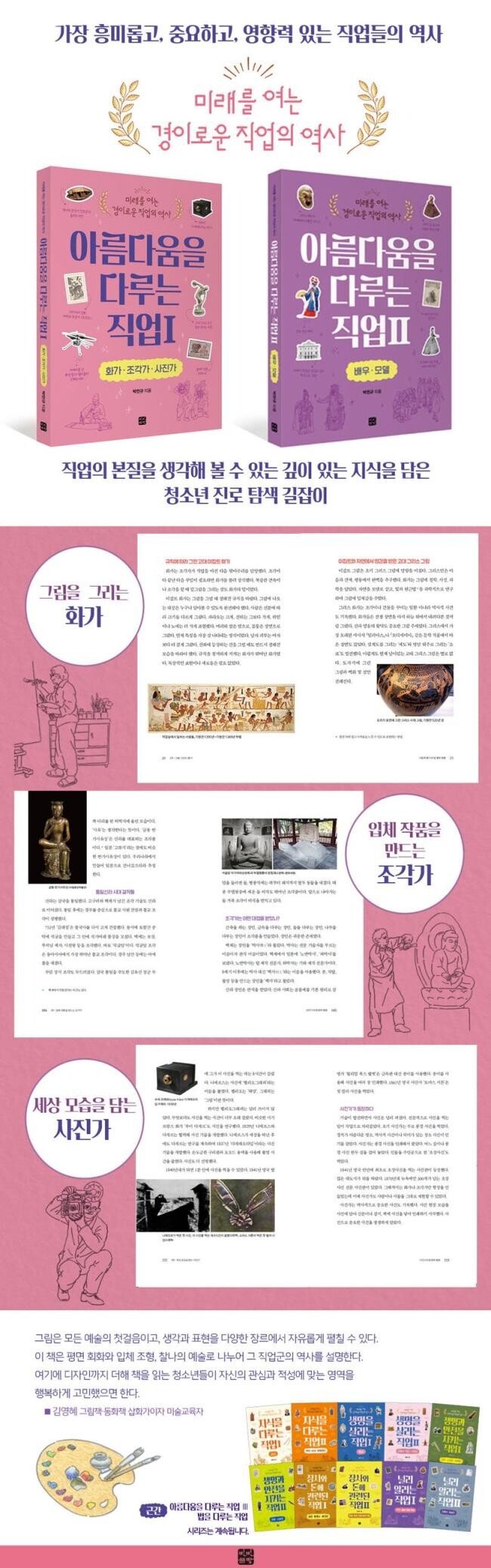 꿈이 화가인 아이들은 주변 사람들로부터 그림을 잘 그린다는 칭찬을 곧잘 듣는 친구들이다. 그림은 모든 예술의 첫걸음이고, 생각과 표현을 다양한 장르에서 자유롭게 펼칠 수 있다. 이 책은 평면 회화와 입체 조형, 찰나의 예술로 나누어 그 직업군의 역사를 설명한다. 여기에 디자인까지 더해 책을 읽는 청소년들이 자신의 관심과 적성에 맞는 영역을 행복하게 고민했으면 한다.