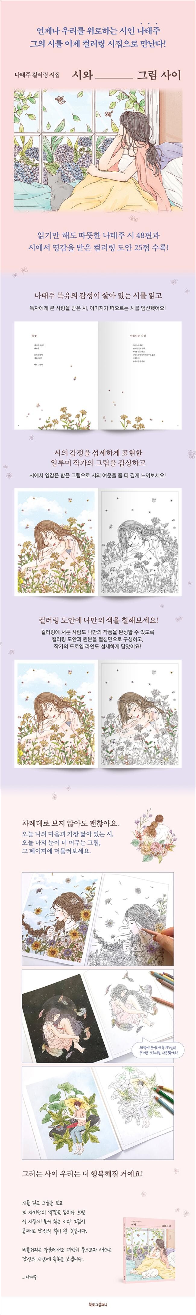 《시와 그림 사이》는 텍스트로만 시를 읽고 지나가는 기존의 시집과는 달리, 그림을 보고 컬러링을 하며 한층 더 낭만적으로 시를 즐기게 해준다.