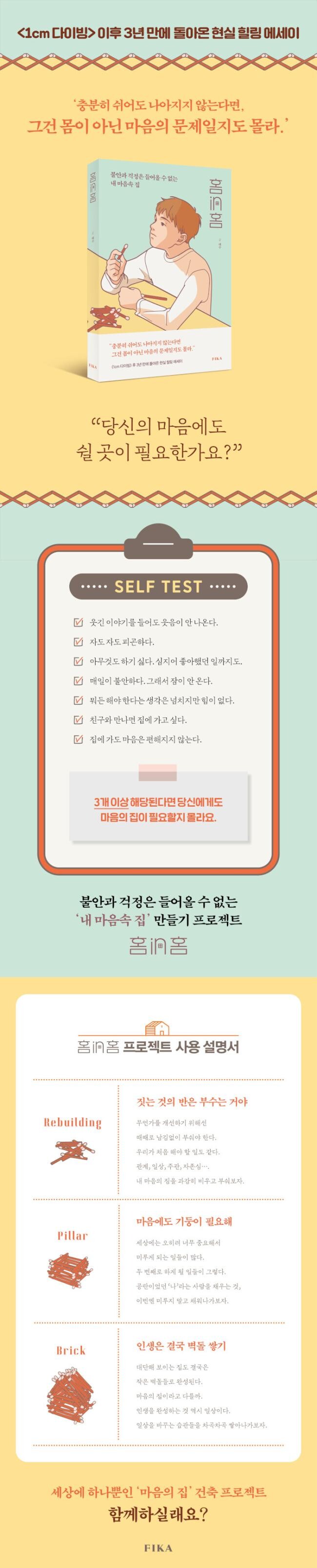 이 책은 2020년 출간 이후 국내에서만 20만 부 이상 판매되며 돌풍을 일으켰던《1cm 다이빙》 저자의 두 번째 에세이입니다. 전작이 행복을 찾기 위해 현실에서 벗어나는 방법을 담았다면, 이번에는 “마음이 진정으로 쉴 곳 ‘내 마음속 집’을 짓는 방법”을 담았습니다. 뭔지 모르게 불안정한 현재를 살아가는 여러분에게 길잡이가 된다면 좋겠습니다. 세상에 하나뿐인 ‘마음의 집’ 만들기, 함께하실래요?