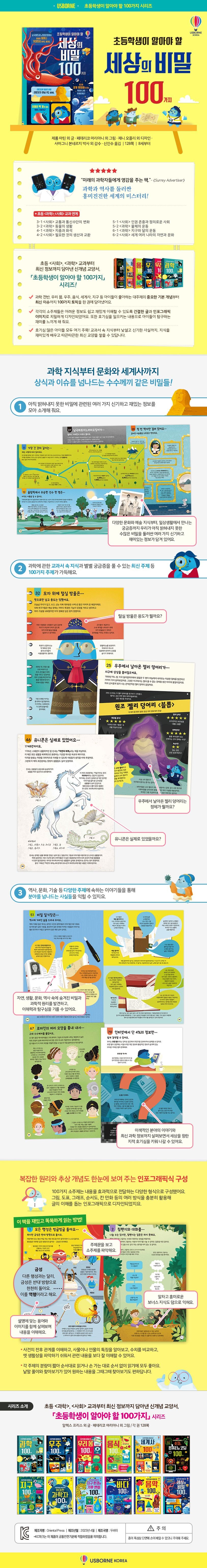 이 책은 사람들이 아직 밝혀내지 못한 수많은 ‘비밀’과 관련된 다양한 문화와 역사, 과학 지식까지 여러 가지 신기하고 재미있는 정보가 담겨 있어요. 기자에 있는 스핑크스는 진짜 스핑크스일까요? 우주에서 날아온 젤리 덩어리는 정체가 뭘까요? 모자 위에 털실 방울은 용도가 뭘까요? 유니콘은 실제로 있었을까요? 등 세계에서 가장 흥미롭지만, 아직 명확한 답을 찾지 못한 100가지 주제를 제시하고 관련된 재미있는 사실을 간단히 알려 주지요. 자연, 생활, 문화, 역사 속에 숨겨진 비밀과 과학적 원리를 발견하고, 세상에 대한 이해심과 탐구심을 기를 수 있어요.