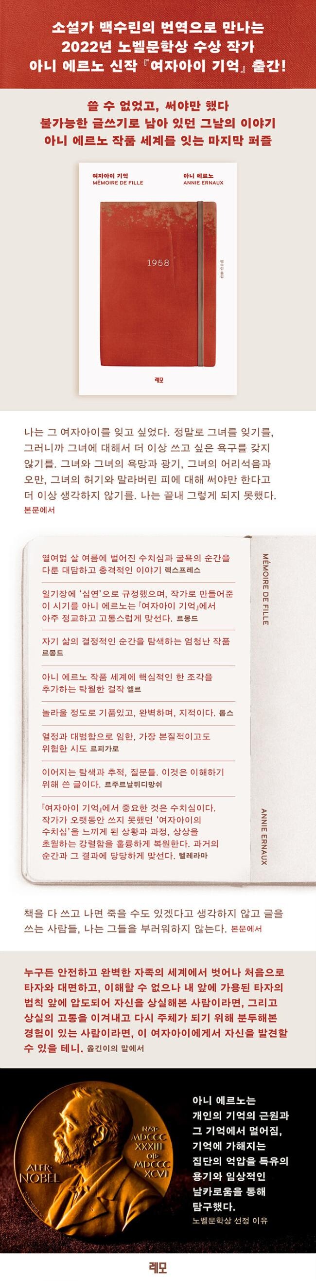 2022년 노벨상 수상 작가 아니 에르노의 2016년 작품, 『여자아이 기억』이 소설가 백수린의 번역으로 출간되었다. 1958년 열여덟 살의 여름에 벌어진 이해할 수 없는 어떤 사건과 그 사건이 불러온 파장들을 작가는 끈질기게 추적한다. 1958년에서 1960년까지 2년의 시간이 자신을 작가로 만들었다고 스스로 일기에서 언급할 정도로 이 사건은 작가로서의 아니 에르노의 삶에 강렬한 흔적을 남겼다.
