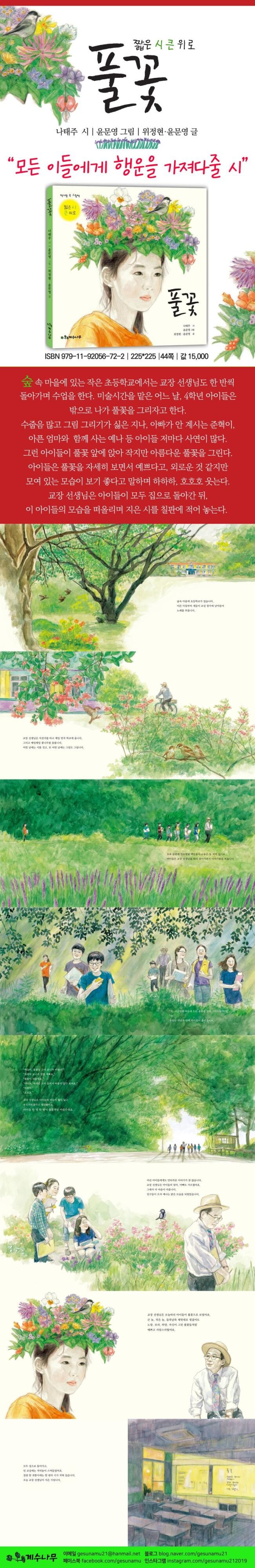 숲속 마을 초등학교 교장 선생님은 한 반씩 돌아가며 수업을 한다. 미술시간을 맡은 어느 날, 4학년 아이들은 밖으로 나가 풀꽃을 그리자고 한다. 수줍음 많고 그림 그리기가 싫은 지나, 아빠가 안 계시는 준혁이, 아픈 엄마와 함께 사는 예나 등 아이들마다 사연이 있다. 그런 아이들이 풀꽃 앞에 앉아 작지만 아름다운 풀꽃을 그린다. 교장 선생님은 아이들에게 꽃말을 알려 주며 마음을 나눈다. 풀꽃은 작지만 모여 있어 외롭지 않아 보인다. 숲속 학교 아이들은 풀꽃 덕분에 행복한 하루를 보내고, 교장 선생님은 저녁놀이 스민 빈 교실 칠판 한 귀퉁이에 시 한 편을 적어 놓는다. 짧지만 큰 위로를 전하는 시 ‘풀꽃’이다.