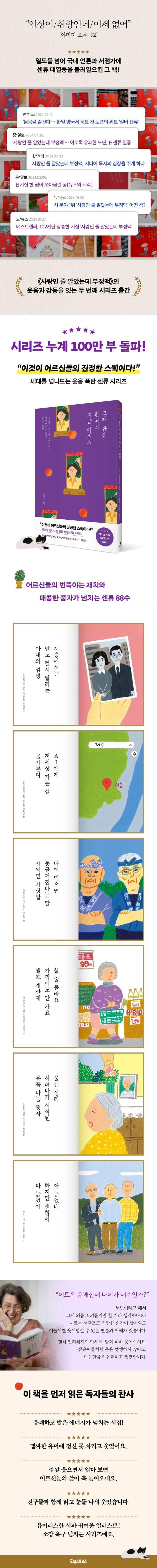 세월이 흐르면 누구나 공평하게 노년을 맞이한다. 피하려고 해도 피할 수 없는 나이 듦을 좀 더 가볍게 받아들이는 방법을 찾고 있다면 이 책을 읽어보자. 페이지마다 가득한 어르신들의 익살과 유머에 깔깔 웃다 보면 어느덧 다가올 앞으로의 삶이 한층 가볍게 느껴질 것이다.