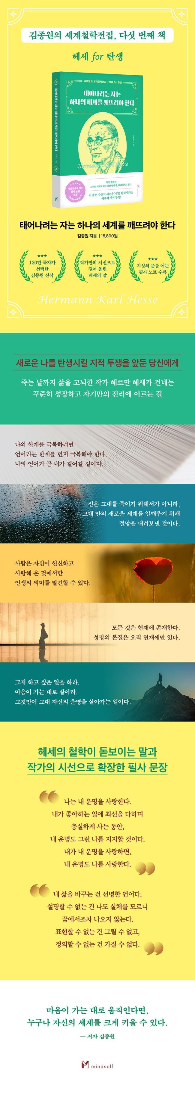 《태어나려는 자는 하나의 세계를 깨뜨려야 한다》는 철학자와 작가, 두 인물의 만남을 통해 독자의 삶을 향한 질문을 던진다. 헤세가 던진 문장을 오늘의 시간에서 다시 해석하고, 작가가 건네는 안내에 따라 독자는 스스로의 삶을 되새기며 ‘새로운 나’로 나아갈 용기를 얻게 된다.