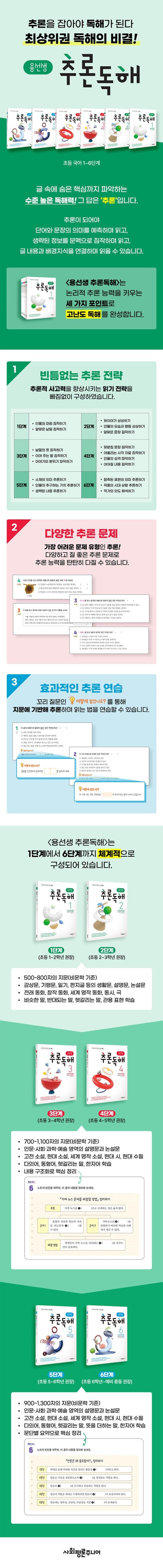인물의 마음·행동·가치관 짐작하기, 생략된 낱말과 문장 짐작하기, 낱말의 뜻 짐작하기, 이어질 내용 짐작하기, 함축된 표현의 의미 추론하기, 작가의 의도 짐작하기 등 추론적 사고력을 향상시키는 읽기 전략을 빠짐없이 구성하였습니다.