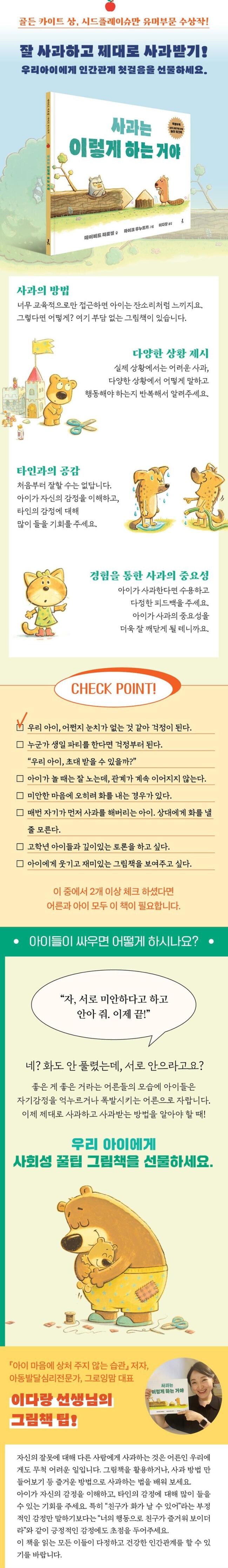 모든 인간은 실수합니다. 실수 자체는 문제가 아닙니다. 실수와 잘못에서 우리는 배우고 성장하니까요. 문제는 실수 때문에 깨어지는 인간관계! 어떻게 사과해야 용서받고, 실수 이전보다 더 깊은 관계가 될까요? 제대로 사과할 줄만 알아도 인간관계는 훨씬 더 수월하게 풀리고 더 능력 있는 리더가 될 수 있습니다. 이 책은 언제, 왜, 어떻게 사과해야 하는지 알려주는 실용적인 꿀팁 그림책 이랍니다.