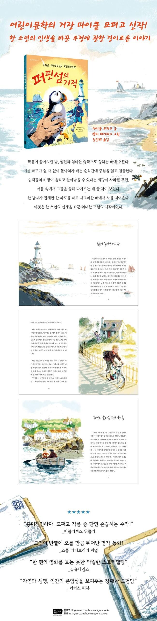 『퍼핀섬의 기적』은 가혹한 현실 속에서 피어나는 인류애, 생명에 대한 존중, 예술을 향한 열정, 자신만의 결을 지키며 살아온 사람의 인생을 흡입력 있게 담아낸다. 외딴섬 등대지기와 한 소년의 놀랍고도 위대한 이 이야기는 많은 어린이 독자에게 큰 울림으로 다가갈 것이다.