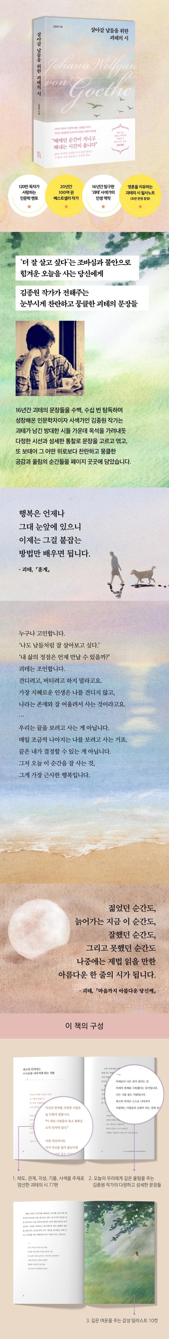 『살아갈 날들을 위한 괴테의 시』는 어떻게 나라는 존재와 잘 어울려서 살아갈 수 있는지, 그 길을 함께 해주는 뜻깊은 여정이 되어줍니다. 김종원 작가가 16년 동안 수백, 수천 번 읽고 또 읽으며 의미를 곱씹고, 그럼으로써 매일같이 성장해왔다고 고백한 괴테의 눈부신 문장들을 통해 ‘살아갈 날들을 위한’ 위로와 희망을 우리에게 잔잔히, 그러나 깊은 숨결로 들려줍니다.