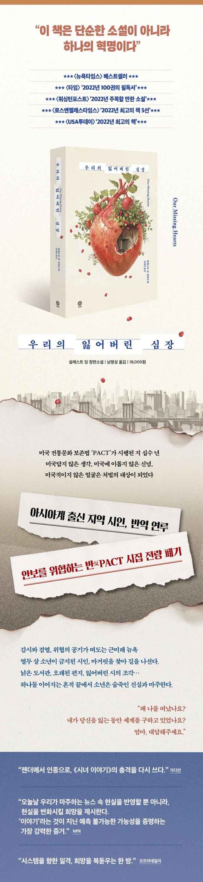 《작은 불씨는 어디에나》 《내가 너에게 절대로 말하지 않는 것들》로 뜨거운 사랑을 받으며 이름을 각인시킨 소설가 설레스트 잉의 최신작 《우리의 잃어버린 심장》이 한국 독자를 찾는다. 팬데믹 이후 더욱 선명해진 아시아계 차별을 중심으로, ‘미국적’이지 않은 생각과 외모가 탄압받는 가상의 시대를 배경으로 한다. 정교하게 설계된 미스터리, 건조한 듯 응축된 문체, 짜임새 있는 구조와 같은 문학적 강점은 여전히 빛을 발하며, 시대를 정조준하는 통찰이 더해져 깊은 울림을 남긴다.