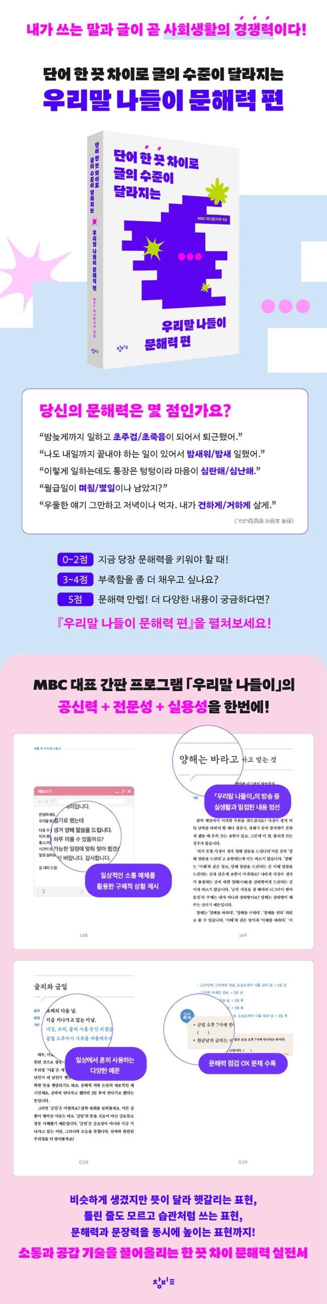 특히 주목할 것은 친구와의 메시지, SNS 포스팅, 신문 기사 등 일상생활뿐 아니라 업무 메신저, 이메일 등 직장생활에서 흔히 사용하는 소통 매체를 활용해 구체적인 상황과 예문을 보여준다는 점이다. 이를 통해 사회생활 업무력과 경쟁력까지 높이려면 우리말을 어떻게 써야 하는지 쉽게 이해할 수 있도록 구성했다. 이 밖에도 생활밀착형 풍성한 예문과 OX 문제, 나의 문해력 수준을 점검해볼 수 있는 ‘문해력 평가 시험’까지 실속 있게 담았다.