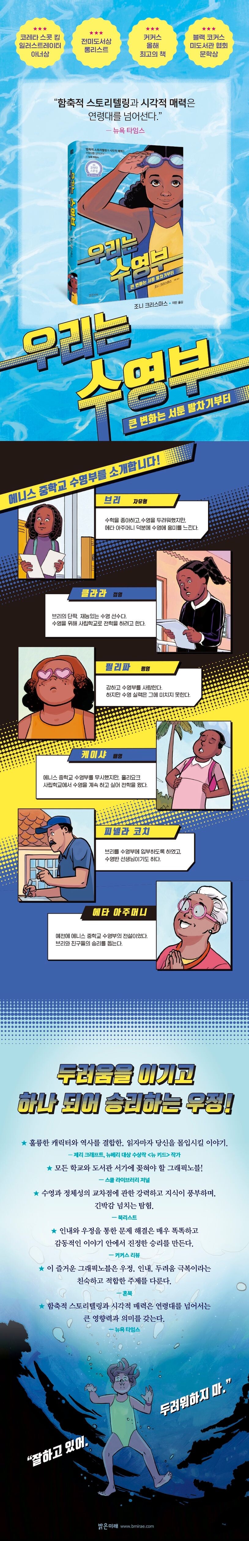 수영을 두려워 하던 아이가 수영 대회에서 우승하는 이야기는 스포츠 영화 같은 곳에서 많이 본 것 같은 이야기 구조이다. 하지만 자신의 내면의 두려움을 마주하고 그것을 이겨내기 위한 노력을 작가는 아주 잘 그려냈을 뿐 아니라, 친구들과의 관계와 그 관계 속에서 일어나는 갈등과 협동, 우정에 대한 이야기도 완벽하게 표현해 내어 감동을 자아낸다.