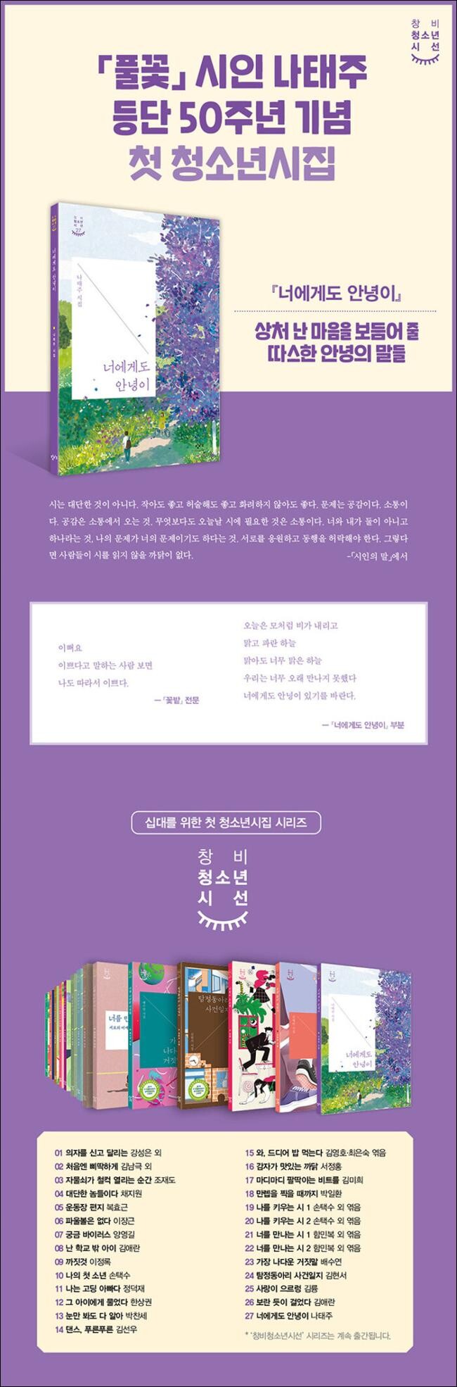 ‘창비청소년시선’은 전문 시인이 쓴 청소년시를 발굴하고 정선해 내는 본격 청소년시 시리즈이다. 이번에 출간된 나태주 시집 『너에게도 안녕이』까지 총 27권의 ‘창비청소년시선’이 나왔다. 앞으로도 ‘창비청소년시선’은 청소년시의 다양한 폭과 깊이를 가늠하며 청소년들 곁을 지킬 조금은 위태롭고 조금은 삐딱한 노래들을 찾아 나갈 것이다.