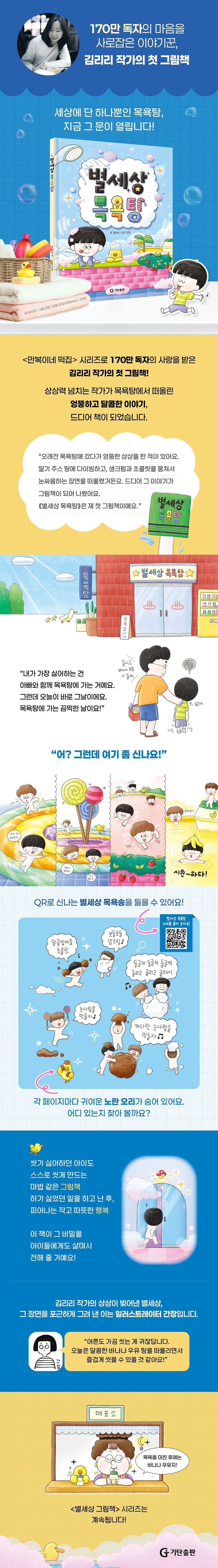 그리고 혹시 발견했나요? 책 속 목욕탕에는 또 다른 동물도 등장해요. 그 동물은 무엇일까요? 아마 재미있게 읽은 독자라면 금세 발견할 거예요. 혹시 발견하지 못해도 괜찮아요. 다시 읽어 보면 되니까요! 이 동물은 <별세상 그림책> 두 번째 시리즈에 나오게 될 친구예요. 김리리, 간장 작가의 환상적인 콜라보는 계속 이어질 거거든요.