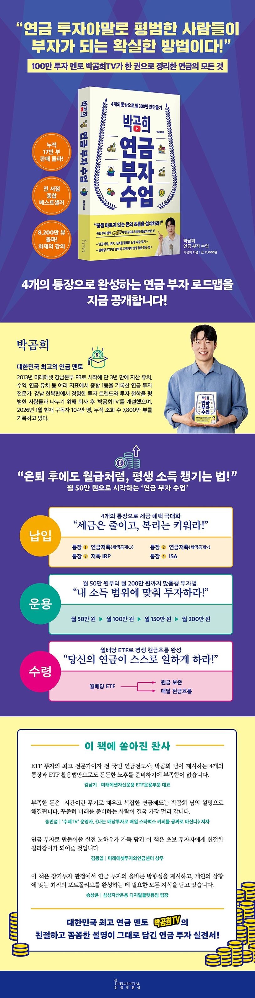 “연금 투자야말로 평범한 사람들이부자가 되는 확실한 방법이다!”81만 투자 멘토 ‘박곰희TV’가 한 권으로 정리한 연금의 모든 것대한민국이 초고령사회에 진입한 지금, 더 충격적인 현실이 드러났다. 서울금융복지상담센터 분석에 따르면 개인파산 신청자의 86%가 50대 이상 중장년층이며, 통계청 자료로는 성인 4명 중 1명이 아예 노후 준비를 포기한 상태다. 준비 없는 노후는 더 이상 남의 일이 아니다.이런 절망적인 현실 앞에서 베스트셀러 《박곰희 투자법》 출간 5년 만에 돌아온 금융 유튜버 박곰희가 이번엔 연금으로 평생 월급 받는 비밀을 공개한다. 증권사 출신인 저자는 5년간 금융 유튜버로 활동하며 수많은 구독자의 연금 고민을 직접 들어왔다. “투자를 잘 모르는데 연금은 어떻게 준비해야 할까요?”, “3억 원으로 정말 노후 생활이 가능할까요?”, “55세, 연금 준비 늦은 걸까요?”와 같은 절실한 질문들에 대한 현실적이고 구체적인 답변을 《박곰희 연금 부자 수업》에 녹여냈다. 복잡한 투자 지식이나 목돈 없이도 4개의 절세 통장과 검증된 투자 방법만으로 누구나 따라 할 수 있는 연금 부자 로드맵을 완성했다.이 책의 가장 혁신적인 부분은 은퇴 후 안정적인 자산 인출 전략으로 ‘4% 룰’을 적용했다는 점이다. 저자는 은퇴자금에서 매년 4%씩 인출하면 30년 이상 또는 평생 자금이 고갈되지 않는다는 검증된 방법론을 활용해 원금은 보존하면서 수익으로만 생활하는 ‘마르지 않는 현금흐름’을 만드는 구체적인 방법을 제시한다. 실제로 노벨상을 수여하는 노벨재단도 이와 유사한 원리로 120년간 꾸준히 상금을 지급해오고 있다. 저자는 이 과학적 근거를 바탕으로 연금 자산의 4~6%만 매년 인출하면 평생 사용할 수 있는 전략을 구체화했다.또한 월 50만 원부터 200만 원까지 개인의 투자 여력에 따른 구체적인 포트폴리오와 납입 전략을 제시하고, 자산 규모별로 실제 현금흐름이 어떻게 만들어지는지 보여준다. 단순히 돈을 모으는 것에 그치지 않고, 연금 개시부터 월배당 중심 포트폴리오 전환, 세금 최적화, 수령 방식 선택까지 연금 수령의 모든 과정을 5단계로 나누어 상세히 안내한다.저자는 “완벽한 계획을 세우는 것보다 불완전하더라도 우선 시작하는 것이 중요하다”고 강조한다. 30~40대 직장인부터 50대 예비 은퇴자까지, 노후 준비를 시작하고 싶지만 어디서부터 손대야 할지 모르는 투자 초보자들에게 이 책은 가장 현실적이고 검증된 해답을 제시한다.“은퇴 후에도 월급처럼, 평생 소득 챙기는 법!”81만 구독자가 검증한 대한민국 최고 연금 멘토 ‘박곰희TV’신작“노후 준비는 하고 있는데, 제대로 하고 있는 건가?” 대부분의 직장인이 품고 있는 의문이다. 퇴직연금 계좌에는 수천만 원이 쌓여가는데 현금으로 방치하고, 정작 주식투자는 용돈 수준으로만 하는 현실. 연금저축은 가입했지만 어떤 상품을 선택해야 할지 몰라 은행 직원 추천에만 의존하는 상황. 이런 고민들이 쌓이면서 많은 사람이 유튜브에서 답을 찾기 시작했고, 그 중심에 ‘박곰희TV’가 있었다.베스트셀러 《박곰희 투자법》으로 개인투자자들에게 신뢰를 쌓은 박곰희가 5년 만에 펴내는 신작 《박곰희 연금 부자 수업》이 드디어 출간된다. 이 책은 81만 구독자들이 검증한 연금 투자 노하우의 집대성으로, 단순한 투자 기법을 넘어서 노후 파산 없는 인생을 설계하는 근본적인 해법을 제시한다.이 책의 가장 큰 특징은 안정적인 자산 인출 전략인 ‘4% 룰’의 원리를 연금 설계에 접목했다는 점이다. 은퇴자금에서 매년 4%씩 인출하면 30년 이상 자금이 고갈되지 않는다는 이 검증된 방법론을 활용해, 원금은 보존하면서 수익으로만 생활하는 ‘마르지 않는 현금흐름’을 만드는 방법을 구체적으로 제시한다. 핵심은 4개의 통장을 체계적으로 활용하는 것이다. 연금저축, IRP, ISA 등을 전략적으로 운용해 세제혜택을 극대화하면서도 안정적인 노후 자금을 준비하는 방안을 소개한다.“4개의 통장으로 완성하는 연금 부자 로드맵!”은퇴 후에도 월급처럼, 월 300만 원 평생 소득 챙기는 법《박곰희 연금 부자 수업》은 연금 준비를 납입-운용-수령 3단계로 체계화했다. 먼저 납입 단계에서는 연금저축펀드 2개, 저축 IRP, ISA 등 ‘4개의 절세 통장’을 전략적으로 활용하는 방법을 소개한다. 세액공제를 받는 연금저축과 받지 않는 연금저축을 분리 관리함으로써 세제혜택과 유동성을 모두 확보하는 지혜로운 설계다. 저자는 월 50만 원부터 200만 원까지 개인의 투자 여력에 따른 구체적인 포트폴리오와 납입 전략을 단계별로 제시한다.운용 단계에서는 투자 초보자도 쉽게 따라 할 수 있는 5가지 투자법을 난이도별로 안내한다. MMF와 금리형 ETF로 안전하게 시작해 TDF의 자동 운용 시스템을 거쳐, 월배당 ETF 전략과 자산배분 포트폴리오까지 선택할 수 있다. 특히 통장별 맞춤 투자 전략을 통해 수익률을 극대화하는 방법을 상세히 다룬다. 연금저축에서는 자산배분을, 저축 IRP에서는 TDF를, ISA에서는 월배당 ETF를 활용하는 식으로 각 계좌의 특성에 최적화된 투자법을 제안한다.수령 단계에서는 연금 부자들만 아는 