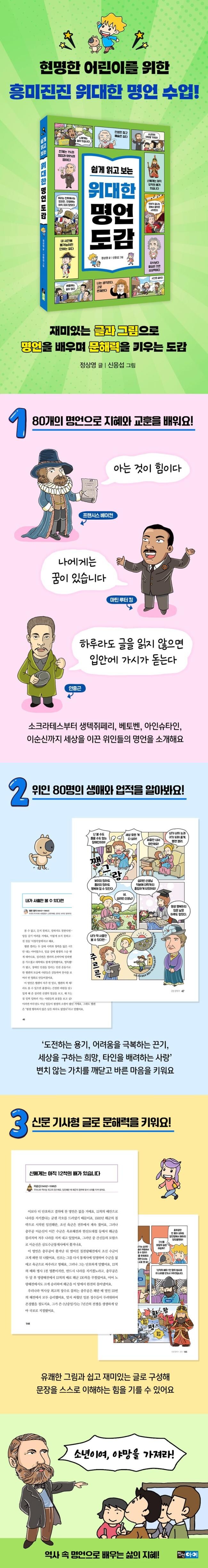 《쉽게 읽고 보는 위대한 명언 도감》은 위인 80명을 철학자, 문학가, 예술가, 과학자, 정치가·군인으로 나누어 그들의 이야기를 다양한 예시와 그림으로 흥미진진하게 소개합니다. 호흡이 짧은 신문 기사형 글로 내용을 구성해 어린이 독자가 스스로 쉽게 읽으며 문해력을 키울 수 있습니다.