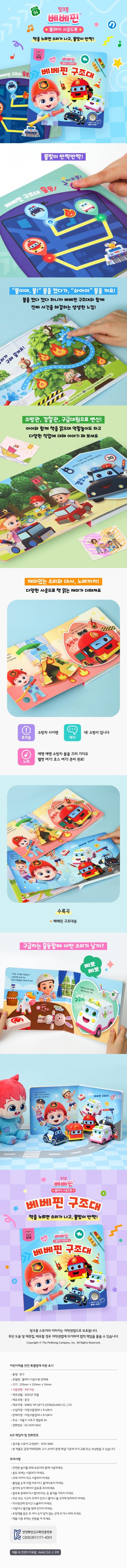 10 - 11 페이지의 사건 해결 장면에서는 불을 켰다 껐다 놀이할 수 있어요. 1번 불이야, 불! 버튼을 눌러 불을 켜고 2번 솨아아! 버튼을 눌러 불을 꺼요! 직접 불을 켰다 껐다 하며 베베핀 구조대와 함께 진짜 사건을 해결하는 것처럼 생생한 재미를 느껴 보세요.