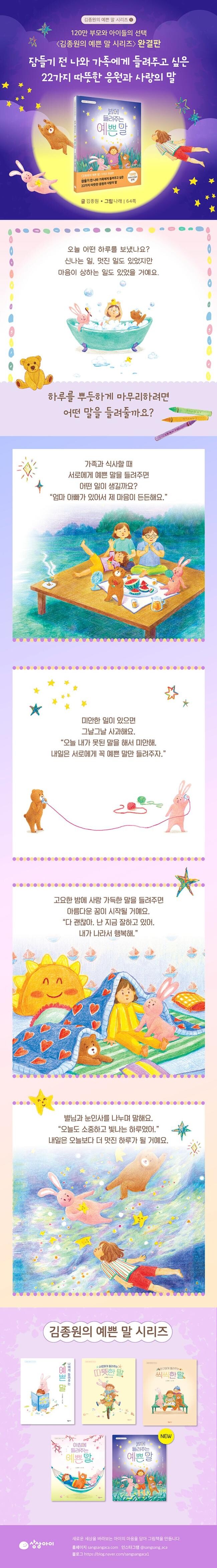 이 시리즈의 완결판 《밤에 들려주는 예쁜 말》은 아이들이 하루를 마무리하며 가져야 할 습관과 태도, 마음가짐을 22가지 예쁜 말로 전합니다. 아이들이 이 책에 나오는 22가지 예쁜 말을 마음에 담으면 더 크고 단단한 사람으로 성장할 수 있습니다.