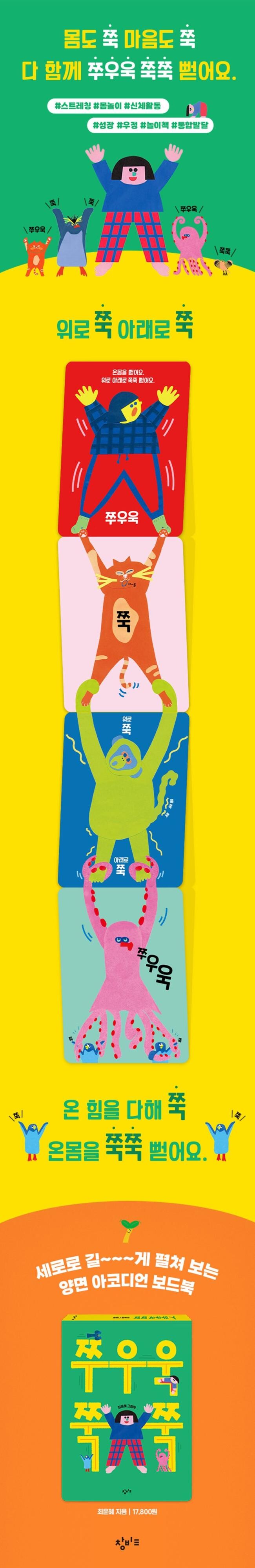 기지개 켜듯 스트레칭 하는 어린이에게서 시작된 이야기가 고양이, 문어, 개미떼를 만날 때까지. 집 안에서 집 밖으로, 바다에서 땅속으로, 우주로 나아가 지구 반대편의 친구를 만날 때까지 쭈우욱 쭉쭉 이어진다. 온몸을 쭉쭉 뻗어 스트레칭 하는 등장인물들의 모습이 꼬리에 꼬리를 물고 이어지는 『쭈우욱 쭉쭉』은 아기 독자를 신나는 몸 놀이의 세계로 이끄는 그림책이다. 다양한 등장인물 중 첫 장과 마지막 장에 각각 홀로 스트레칭 하는 어린이 등장인물을 배치해 주체적 존재로서의 어린이를 강조한 이 책은, 신체 활동을 통해 타자와 관계 맺으며 자신을 둘러싼 세계를 점차 확장해 나가는 아이들을 응원한다. 『쭈우욱 쭉쭉』은 누리과정에서 강조하는 놀이를 통한 발달과 배움을 효과적으로 구현하기 위해 0~3세의 신체 발달 수준을 고려한 스트레칭을 반복해 보여 준 것이 특징이다. 신체 발달 민감기의 영유아들에게 스트레칭은 운동 능력 발달뿐 아니라 몸의 이완을 통한 정서적 긴장 해소, 긍정적 자아개념 형성 등을 도와 더욱 중요하다. 따라서 아기와 함께 『쭈우욱 쭉쭉』을 읽는 양육자나 교육기관의 관계자라면 이 책을 놀잇감처럼 활용해 책 속 등장인물을 따라 하도록 독려할 것을 권장한다. 위아래, 양옆, 이쪽저쪽으로 책과 함께 놀이하듯 몸을 쭉쭉 뻗다 보면 아기 독자는 어느새 건강한 몸과 마음을 가진 어린이로 한 뼘 더 자라게 될 것이다.