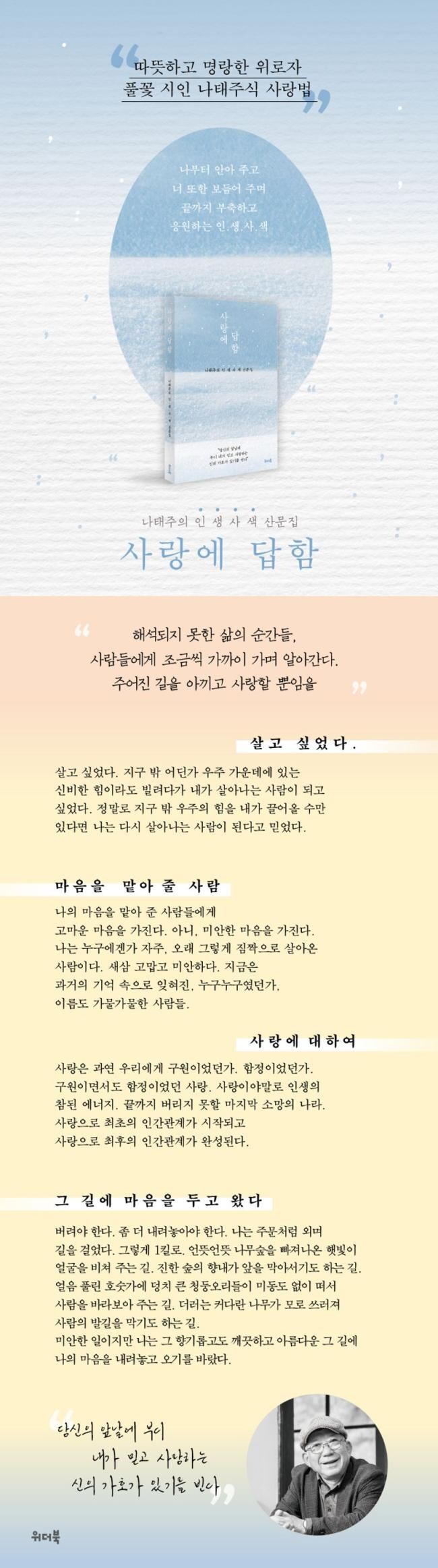 살아가는 풍경이 다 비슷해 보이지만 시인의 눈에 들어와 한 글자 한 글자 쓴 오십 여 편의 글들은 어쩌면 일기 같고, 때로는 기도문 같다. 사랑이라는 인생의 대주제를 시인은 풀꽃처럼 누구나 볼 수 있는 생활 언어로 풀어냈다. 삶의 막막함, 생과사를 오가는 순간들, 결핍과 실패로 괴로워한 기억들을 나직하게 이야기한다. 은행원이 되어 돈을 실컷 세고 싶었으나 43년이나 교사로 일했던 현실, 상실과 질병으로 씨름했던 순간들이 시인의 자양분이 된 이야기들이 순하게 담겨 있다. 크고 높은 사랑이라는 언어가 시인을 통해 밥상머리 이야기처럼 소탈하고 맑아, 읽는 내내 자신의 무거운 짐을 내려놓고 숨을 고르게 된다. 결핍과 아픔으로 가득한 줄 알았던 삶이 사랑과 위로의 목소리들이 있었고, 자신이 믿는 신과 사랑하는 이들의 격려와 응원들이 곳곳에 있었음을 떠올려 준다. 시인의 아버지가 시인에게 들려준 “징글징글하게 좋은 이 세상”에서 힘을 내서 살아왔고 “주어진 길을 아끼고 사랑할” 뿐이라는 삶의 태도를 배운다. “나중까지 아주 나중까지” 보아주는 것이 사랑이라는 시인의 글을 빌려, 누군가에게 이 책으로 사랑에 답해도 좋겠다.