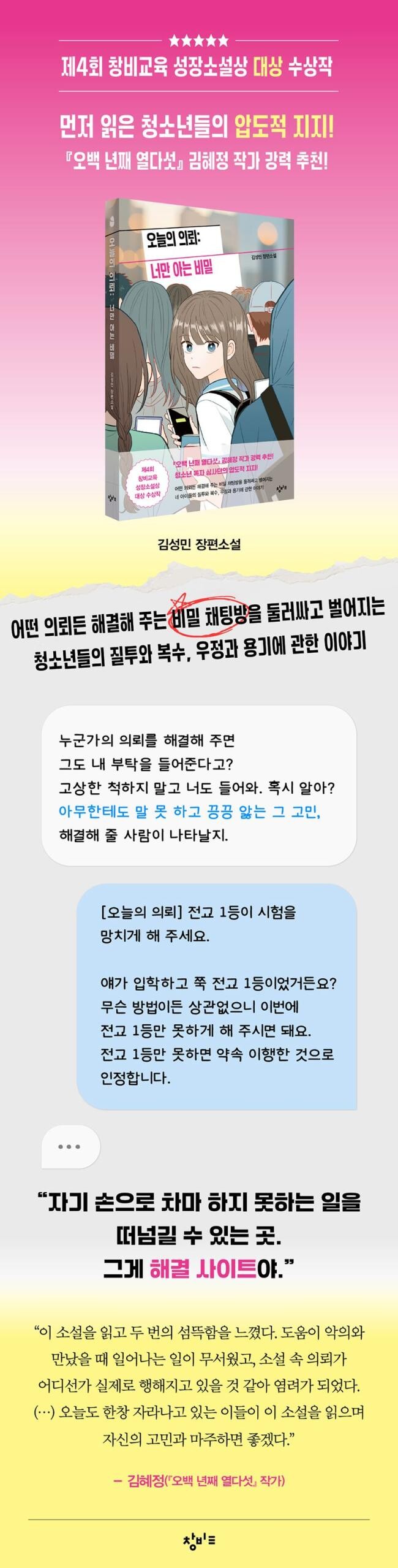 『오늘의 의뢰: 너만 아는 비밀』은 익명의 개인이 복수를 대행시킨다는 흥미로운 설정과 속도감 있는 서사가 읽는 재미를 느끼게 해 준다. 청소년 인물들이 무거운 이야기를 너끈히 짊어지고 문제 해결의 주체로 나선다는 점에서 청소년소설의 미덕도 충분히 살렸다. 곤란한 문제를 다루면서도 짓눌리지 않고 세상의 밝은 곳을 응시하려는 자세도 미덥다. - 「심사평」에서