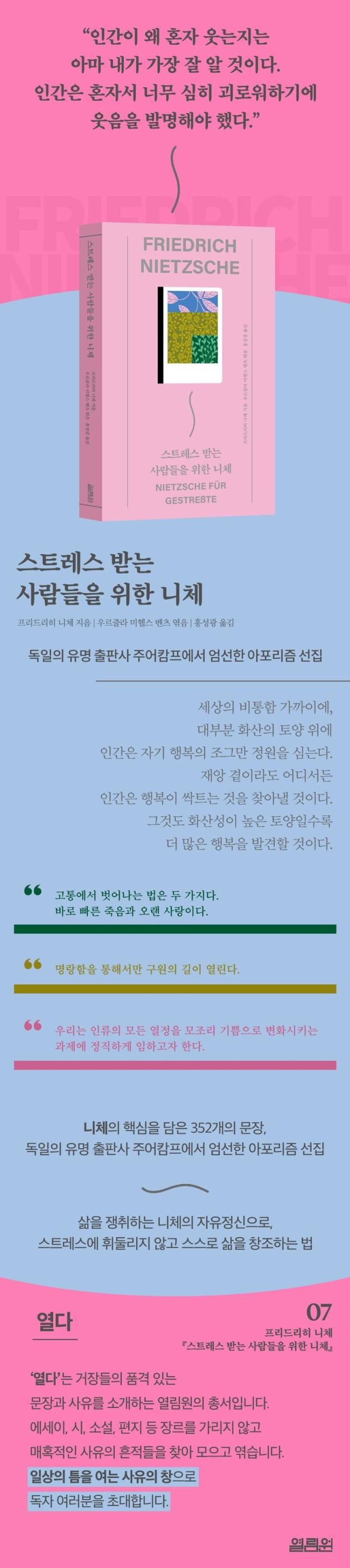 『스트레스 받는 사람들을 위한 니체』는 니체의 본고장 독일에서 직접 대중을 위해 기획하고 엮은 열림원의 아포리즘 선집이다. 이 책의 편저자 우르줄라 미헬스 벤츠는 브레히트, 아도르노, 벤야민 등 세계적인 지성들의 책을 소개해온 독일의 유명 출판사 ‘주어캄프’ 편집자 출신으로, 니체의 전체 사상을 간추려 8장으로 묶고 저작에서 352문장을 엄선했다. ‘자아 - 행복 - 사랑 - 재능 - 정치 - 사유 - 평판 - 자유’로 각 장을 포괄하는 8개의 키워드는 삶에서 떨어트릴 수 없는 뼈대와 같은 요소로, 니체는 위와 관련한 문장들을 관통해 스스로를 단단히 세우고 스트레스로부터 벗어나는 방향을 제시한다. 번역은 『차라투스트라는 이렇게 말했다』 『도덕의 계보학』 『비극의 탄생』 등을 포함한 다수의 니체 원전과 독일 철학서를 번역한 홍성광이 맡았다. 니체의 저작에서 핵심만을 추출한 짧고 굵은 아포리즘에 뒤이어 홍성광의 구체적이고도 심도 있는 해설은 니체의 독창적인 사유를 더욱 풍부하게 읽을 수 있도록 돕는다.