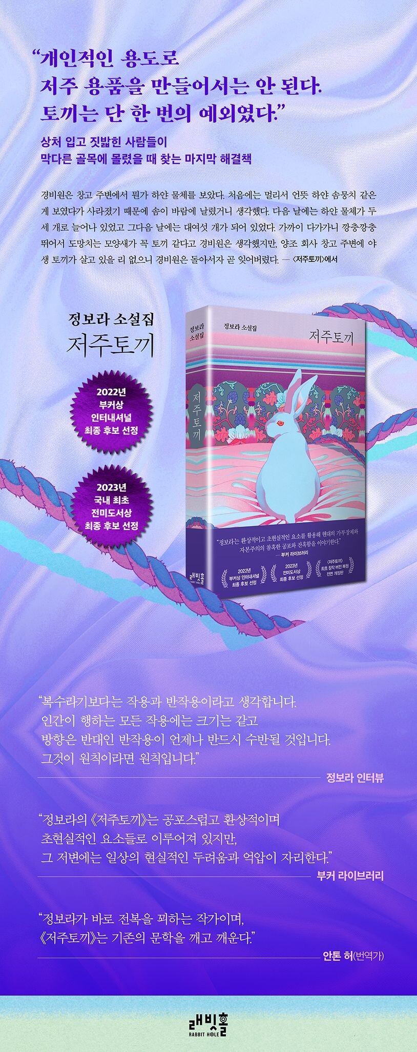 〈작가의 말〉에서 정보라는 이렇게 말한다. “책 전체를 통해서 전달하려는 특별한 교훈이나 메시지는 없다.『저주토끼』는 환상호러 단편집이고, 환상호러 장르는 대중문학에 속하며, 대중문학은 교훈이나 가르침보다는 즐거움을 위해 존재하는 장르이다.” 하지만 이 책을 여는 우리는 낯설고 으스스한 세계의 재미에 빠져들며, 자신에게 상처 낸 이에게 손톱을 세우는 절박한 마음과 무너진 세계를 딛고 앞으로 나아가려는 굳센 용기를 마주하게 될 것이다.