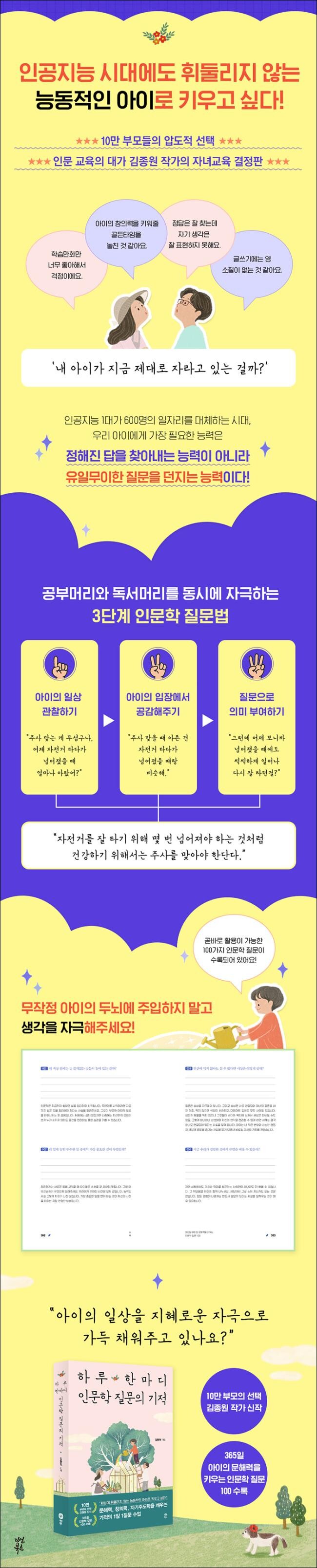 책 뒤에는 실생활에서 간편하게 아이와 함께 주고받을 수 있는 ‘인문학 질문 100’을 저자가 직접 엄선해 부록으로 실었다. 저자는 단순히 질문만 나열하지 않고 해당 질문을 어떤 상황에서 어떤 식으로 활용하면 좋을지 구체적인 해설까지 함께 수록했는데, 이는 저마다 다른 아이의 삶의 조건에 맞춰 독자가 다채롭고 자유롭게 질문을 활용하길 바랐기 때문이다. 질문의 가짓수가 세상에 존재하는 아이와 부모의 숫자만큼 풍부해질 때, 아이들은 그동안 갇혀 있던 내면의 문을 뚫고 나와 세상 밖으로 폴짝 뛰어들 것이다.
