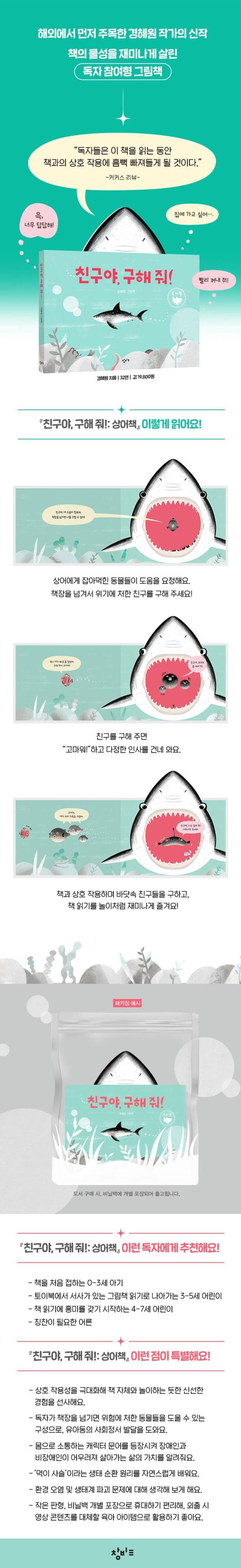 『친구야, 구해 줘!: 상어책』 은 책 속 등장인물과 상호 작용하며 보는 인터랙티브 그림책이다. 책장을 넘길 때마다 상어에게 잡아 먹힌 바다 동물이 독자에게 도움을 요청하면서, ‘책장 넘기기’라는 독자의 반응을 자연스럽게 이끌어 낸다. 이 책은 책장을 차례로 넘기면 상어에게 잡아 먹힌 동물들을 구하게 된다는 구성으로 독자에게 능동적 책 읽기의 즐거움을 알게 한다. 특히 아직 왼쪽에서 오른쪽으로 책을 읽는 우리나라의 책 읽기 관습이 익숙하지 않은 유아를 배려해 책장을 넘기는 행위 자체를 반복적 놀이 요소로 활용한 세심함이 돋보인다. 책장을 넘겨 책 읽기를 이어가는 것만으로도 책 속 등장인물들을 구해 줄 수 있다는 설정, 도움을 준 독자에게 저마다의 방식으로 고마움을 표현하는 책 속 동물들의 모습은, 어린이에게는 서로 도우며 살아가는 건강한 삶의 방식을 가르쳐 주고, 성인에게는 지속적 독서를 이어가게 하는 원동력이 되어 줄 것이다.