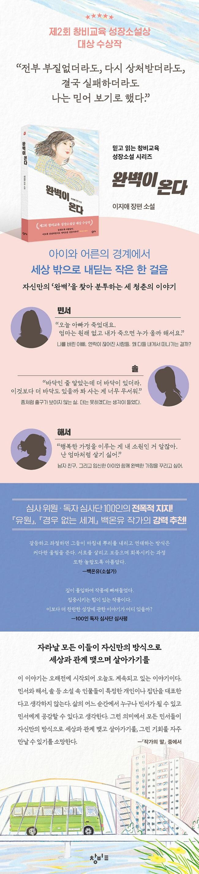 등단작으로 수상의 영예를 쥔 이지애 작가는 “슬프고 불편하지만 조심스럽게 다루어야 할 일”이라며 “누구나 민서가 될 수 있고 민서에게 공감할 수 있다고, 모든 민서들이 자신만의 방식으로 세상과 관계 맺고 살아가기를, 그럴 수 있는 기회를 자주 만나기를 소망한다”라고 출간에 대한 소감을 밝혔다. 비단 자립 준비 청년뿐만 아니라, 성인이 되어 세상에 나온 모든 이의 마음속에는 각자의 민서가 있을 것이다. 성장은 맨송맨송하면서도 거친 본연의 모습 그대로 세상에 부딪혀 자신을 벼려 내고 마침내 다른 이들과 함께 호흡하는 일임을 「완벽이 온다」는 보여 준다. 작품을 읽으며 청소년 독자들은 성장에 대한 영감을, 성인 독자들은 생경한 세상에 맞닥뜨렸던 자신의 과거와 현재의 성취를 짚어 보며 한층 성숙해지는 계기를 마련할 수 있을 것이다.
