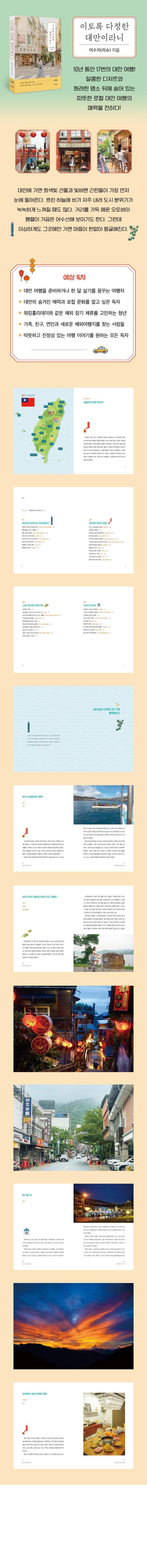 『이토록 다정한 대만이라니』 1부에서는 따뜻한 기후에 이끌려 시작된 여행의 서툴지만 설레는 기억을, 2부에서는 국경을 넘어 이어진 뜻밖의 교류를, 3부에서는 느긋한 여유 속에 머무는 대만의 일상을 기록한다. 그리고 4부에서는 익숙하지만 낯설고, 다채로우면서도 파편처럼 스쳐 간 대만의 순간들을, 5부에서는 음식으로 만나는 대만의 즐거움을 전한다. 더불어 대만 현지에서의 생활 경험을 토대로 한 다양한 문화 이야기를 담아, 여행자는 물론 대만에서의 새로운 시작을 준비하는 이들에게도 도움이 될 만한 정보를 전한다.