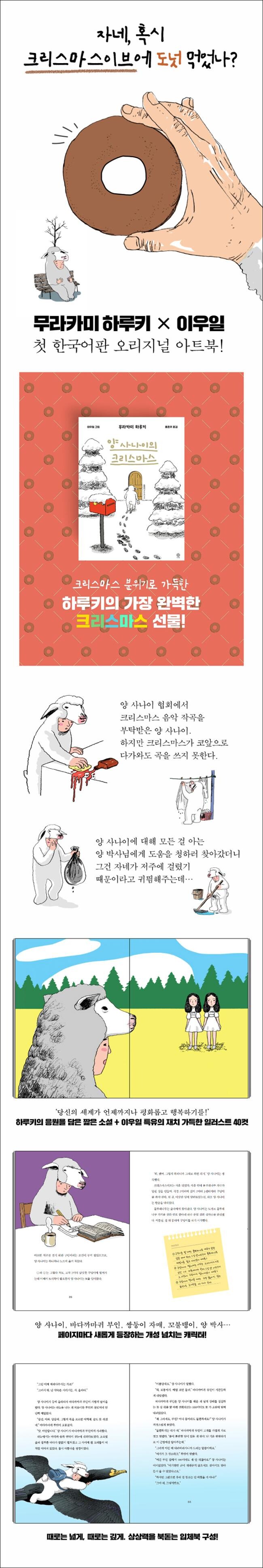 소심하고 성실한 양 사나이, 지혜롭지만 조금 뻔뻔한 바다까마귀 부인을 비롯해 《1973년의 핀볼》의 쌍둥이들을 떠올리게 하는 208, 209 쌍둥이 소녀, 오른 꼬불탱이와 왼 꼬불탱이, 양 박사, 성 양 어르신 그리고 《양 사나이의 크리스마스》의 빼놓을 수 없는 또 하나의 주인공인 도넛 등 페이지마다 개성 넘치는 캐릭터가 연이어 등장하여 하루키 월드의 재미를 더한다. 무라카미 하루키의 팬이라면, 크리스마스와 연말연시 책 선물을 찾는다면, 그리고 조금 특별한 그림책을 기다려왔다면, 또 《양을 둘러싼 모험》의 양 사나이와 재회하고 싶다면, 특히 이우일의 ‘노빈손’ ‘도날드 닭’ 만화를 즐겨 봤다면, 《시드니!》《하와이하다》의 이우일 특유의 재치 넘치는 일러스트가 취향저격이라면, 《후와후와》《버스데이 걸》이 책장에 꽂혀 있다면…… 작가 무라카미의 평화와 행복을 비는 응원을 담은 짧은 소설과 작가 이우일의 재치 넘치는 40여 컷의 그림이 때로는 넓게, 때로는 깊게 페이지 너머로 확장되는 환상적인 크리스마스 파티로 두 팔 벌려 초대한다.