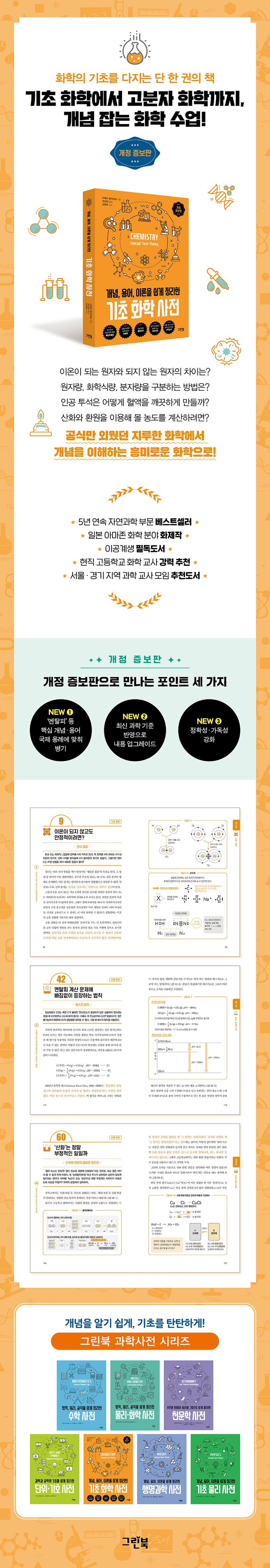아울러 주기율표 12족 원소는 과거 전형 원소로 분류하기도 했으나 현재는 전이 원소로 본다. 이에 따라 초판의 관련 기술을 바로잡았다. 가장 큰 변화인 ‘엔탈피’ 용어 사용 원칙도 안내하되, 국내 교과에서 대체로 ‘에너지’로 포괄해 다루는 점을 고려해 개념 소개 중심으로 적용했다. 이 밖에 압력을 다루는 장을 제외하고는 화학에서 잘 사용하지 않는 단위인 ‘hPa’는 ‘기압’이라는 표현으로 통일하고, 필요한 부분의 설명과 표·그림을 보완했으며, 초판의 일부 오류를 교정해 책의 전반적인 완성도를 끌어올렸다. 핵심 개념과 용어를 정돈하고 내용을 보강한 개정 증보판으로, 화학의 기초를 더욱 탄탄히 세울 수 있을 것이다.