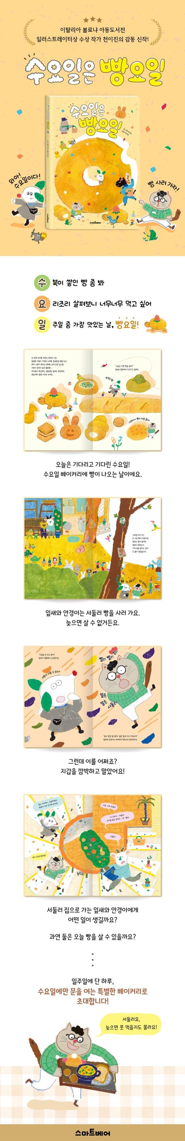 〈수요일은 빵요일〉은 이웃과 나누는 작은 친절이 얼마나 큰 기쁨이 되어 돌아오는지를 보여 주는 따뜻한 그림책입니다. 도움이 필요한 이웃을 못 본 척 지나칠 수 있었지만 마음 따뜻한 잎새와 안경이는 선뜻 손을 내밉니다. 빵을 사는 것보다 곤경에 처한 이웃을 돕는 걸 택한 두 친구에게 돌아온 선물은 책을 덮은 뒤에도 마음 한구석을 오래도록 따뜻하게 해 줍니다.